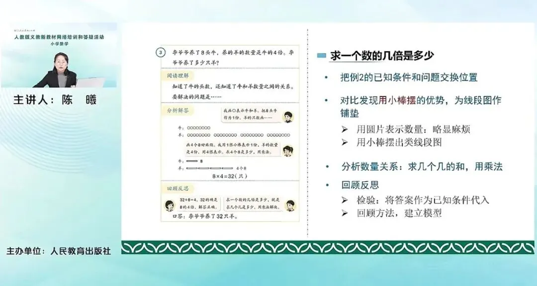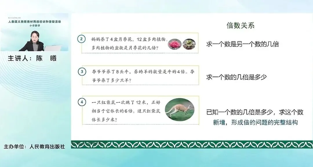 教材接下来给出来,与倍有关的三个变式的问题。求一个数是另一个数的几倍?求一个数的几倍是多少?已知一个数的几倍是多少,求这个数。最后一个问题是一个新增的问题。这样就可以形成倍的问题的完整结构。求倍数、求比较量、求标准量,这三个问题。