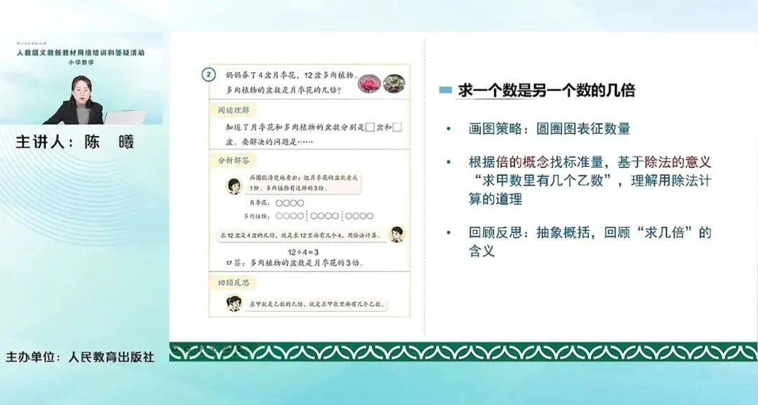那就是要去看,我们运用什么样的这个运算来解决呢?这里给出来一个很重要的,从一年级开始就很经常在用的一个画图策略来进行。去画圆圈表征这个数量,根据倍的概念去找标准量。然后让学生看到,要求多肉植物的盆数是月季花的几倍,就是看多肉植物里面有几个月季花。就是求甲数里有几个乙数,那就可以运用到前面总结的除法意义的模型,理解为什么用除法来进行计算的这个道理。在回顾反思,看到这个学生他进行抽象概括的来回顾求几倍的含义。求甲数是乙的几倍,就是求甲数里面有几个乙数,所以用除法来计算解决。细心的老师可能会发现,我们这一套教材有的口答是在分析与解答,有的是在回顾与反思。我们上一套教材基本上都是在回顾反思的最后。这套教材有的口答是在分析解答,它的变化和区别主要是在,如果回顾反思,回顾的是整个问题本身。与这个问题本身无关了,就是跳出这个问题本身进行一个抽象概括的回顾,那就把口答放在分析解答的上面。这样就是一个小小的变化,所以这里其实学生已经跳出这个例2这个多肉植物和月季花的数量关系本身了,他是从抽象概括的角度去回顾的,所以是把口答放在了上面。