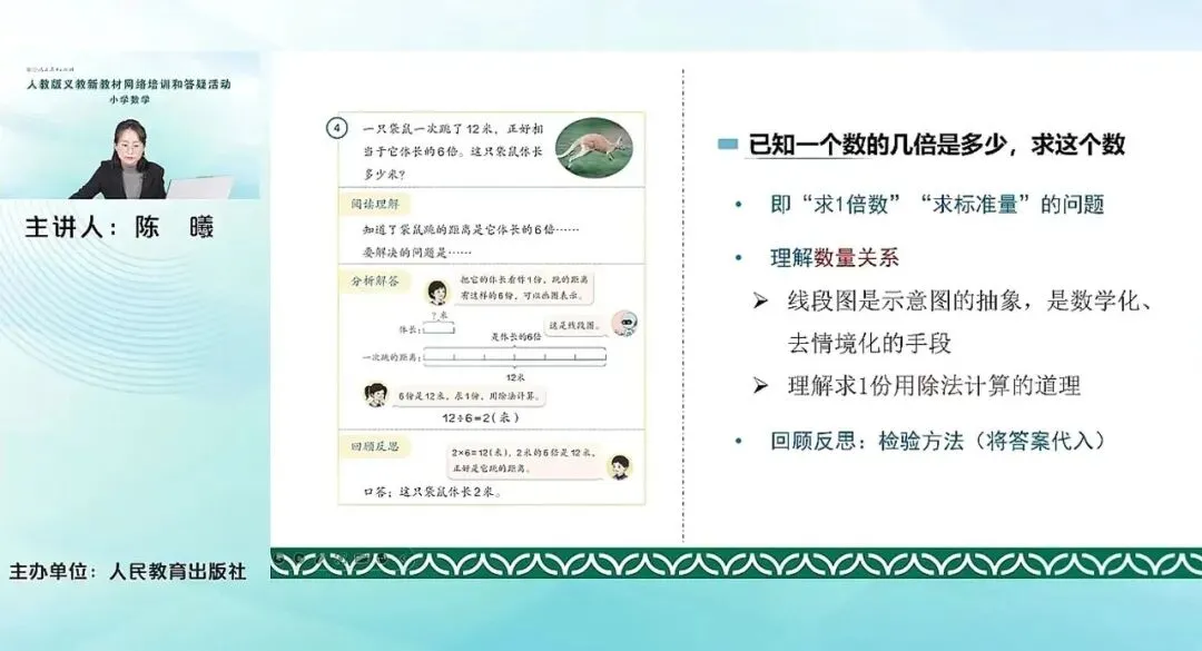 这个问题其实它本质上就是在求标准量,在比较的时候找到的标准量或者一倍数这个问题。这个问题主要的教学难点就在于线段图,这个分析数量关系的工具,让学生要逐步去掌握。我们刚才已经提到,在前一个例题中,学生已经感受到用小棒图或者一条线来表示多个数量其实它是更方便的。到了这里,用线段图它就能够很容易的去接受,去主动的去学习。线段图是比示意图更抽象的、更数学化的、去情境的这种手段,能够帮助学生直观地看到这种数量关系。尤其是在数量更多的情况下,数量关系用线段图能够更清楚地展示出来。通过画线段图,去分析,要求这个体长,其实就是求一份是多少,所以要用除法来解决。同样在回顾反思的时候,也是让学生去用乘法来检验答案是否正确。