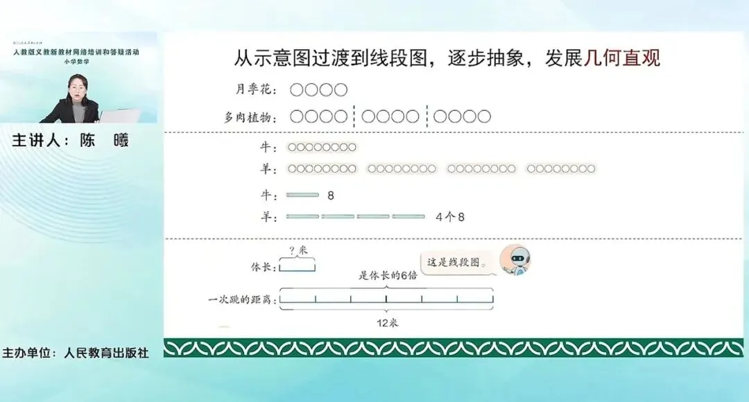通过这么三个例题的教学,可以发现非常重要的一个解决问题的工具和策略,就是画图策略。这也是我们本套教材从一年级开始,就一直在不断地让学生,引导学生去掌握的一种解决问题的方法。在本单元这个方法尤其突出,去分析数量间的关系非常的清楚。可以看到这三个问题本身,它也是从示意图,再到类小棒图,再到摆小棒图,再到画线段图。是逐步的去抽象的,帮助学生去发展几何直观。让学生逐步看到不同的图,它所用的情况不一样,它能够更清楚地表达出更复杂的数量关系。