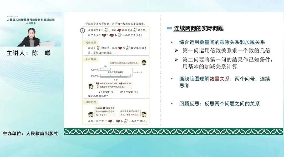 最后的两个例题,连续两问的实际问题。这个问题其实是结合了前面一年级下册的加减关系,让学生综合去运用数量间的乘除关系和加减关系来解决问题。这里第一问是要运用倍数关系,首先求一个数的几倍。然后第二问其实是要用到第一问所求得的这个结果作为已知条件,然后再用基本的加减关系来分析。最后计算。当然这里所画的线段图相对而言也更复杂一点,需要运用两个问号。所以考虑的主要是要去看先求哪个问号,然后进行一个连续的思考。