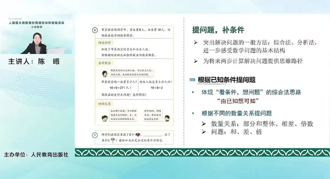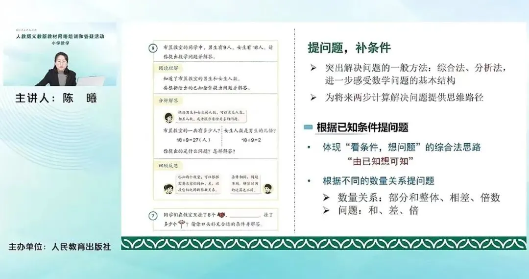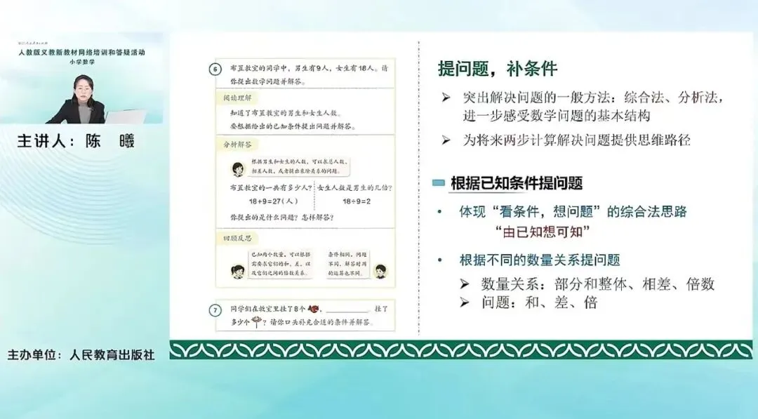 例6,提问题和补条件。这个实际问题是本套教材一个比较新增的。这里需要重点突出的是解决问题的一般方法:综合法、分析法,让学生进一步感受数学问题的基本结构。我们知道,对于解决问题,从上一套教材来说,非常突出的这个解决一般问题的方法就是让他知道要经历这样一个基本的过程:阅读理解、分析解答、回顾反思,这样一般的步骤。那对于具体的分析解答的方法,我们其实并没有一个突出的这种方法的引领。本套教材其实在分析解答这个方法上想进一步突出,也就是刚才提到的综合法和分析法。其实就是,是从问题出发去找条件,还是从条件出发去看我们能解决什么样的问题?让他去感受这个问题之间的这种关系和基本结构。这也是为我们将来更复杂的,由两步计算解决实际问题,提供一个基本的思维的路径。这里例6根据已知条件提问题,体现的是看条件想问题的综合法的思路,就是去看我们已知什么。然后去想可以求得什么,是由已知想可知。可以根据不同的数量关系提问,比如整体和部分的关系、相差的关系、倍数关系,去求得不同的这个问题,和求和的问题,相差的问题等等。