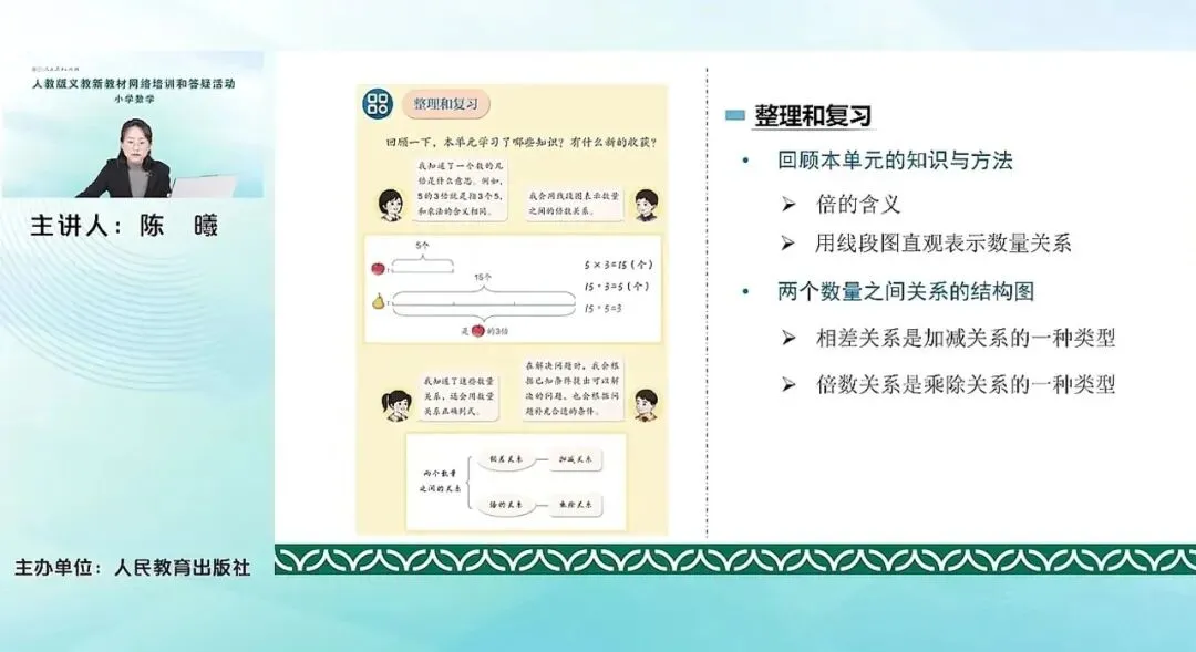 首先是回顾本单元的知识和方法。本单元非常重要的一个概念就是“倍”的含义。其实从方法的角度来讲,需要掌握的是用画图,尤其是线段图来直观地表达数量之间的关系。第二个层次,除此之外还让学生去进一步感受数量之间的这种关系的结构。可以引导学生去发现,相差关系是加减关系的一种类型。倍数关系是乘除关系的类型,有助于学生切换数量之间的这种不同的关系。