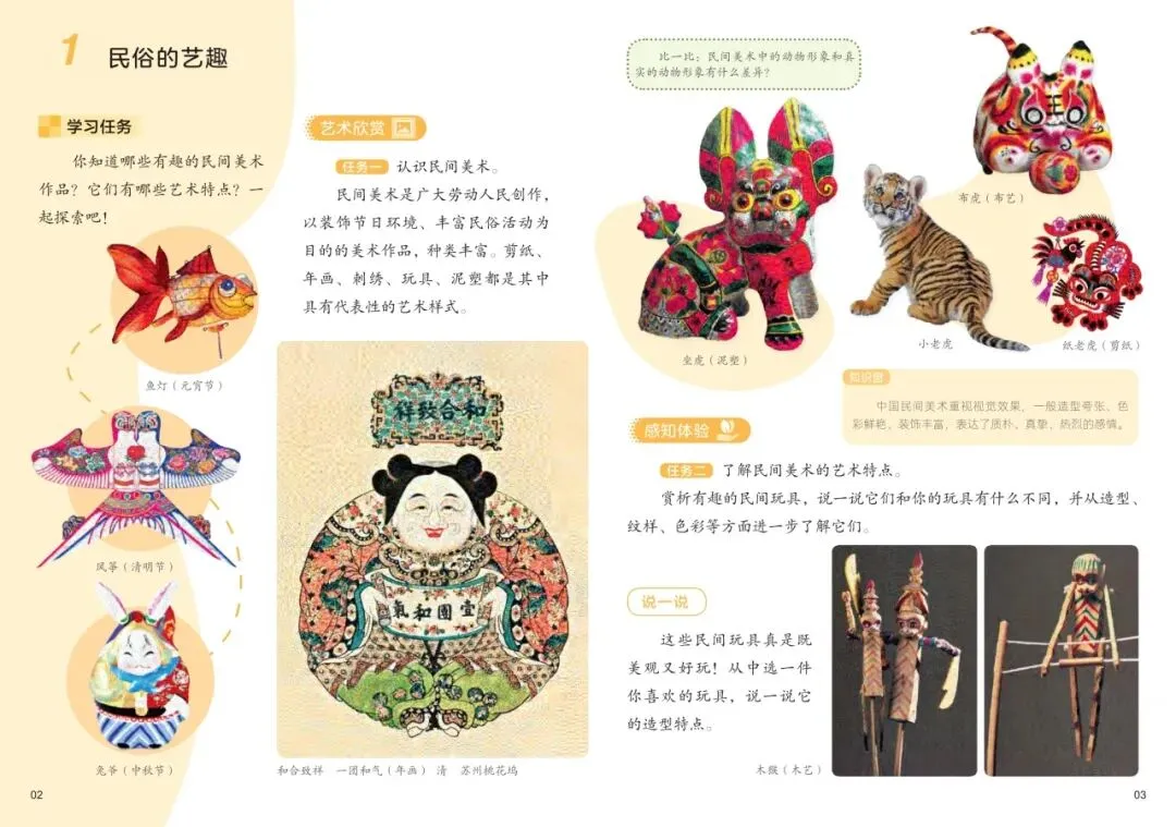 大观念(核心概念): 民间美术是生活的艺术,承载着民族智慧与美好祝愿。