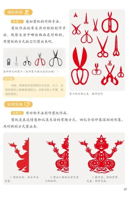 重点: 了解民间美术(以剪纸、泥塑为例)的基本种类、艺术特色;学习并尝试运用对称等手法进行剪纸或泥塑创作。