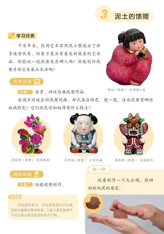 本课是“多彩民艺”单元的最后一课,以民间泥塑为主题。教材选取了陕西凤翔的凤尾鸡、江苏无锡的大阿福、河南淮阳的泥泥狗等典型泥塑作品,引导学生感受不同地域泥塑的风格特色。通过“感知体验”中的“做一做”和“创想实践”中的“会动的泥塑”,引导学生由浅入深地学习泥塑的基本方法:捏基本形、完善细节、注意底部平稳,并鼓励学生尝试创造会动的泥塑(如插上竹签或加弹簧),将传统技艺与现代创意结合。本课旨在让学生在手捏泥土的过程中,感受材料的特性,体验民间艺人“化泥土为神奇”的智慧,理解泥塑作品常蕴含的吉祥寓意,从而加深对民间美术生活化、实用化特点的理解。