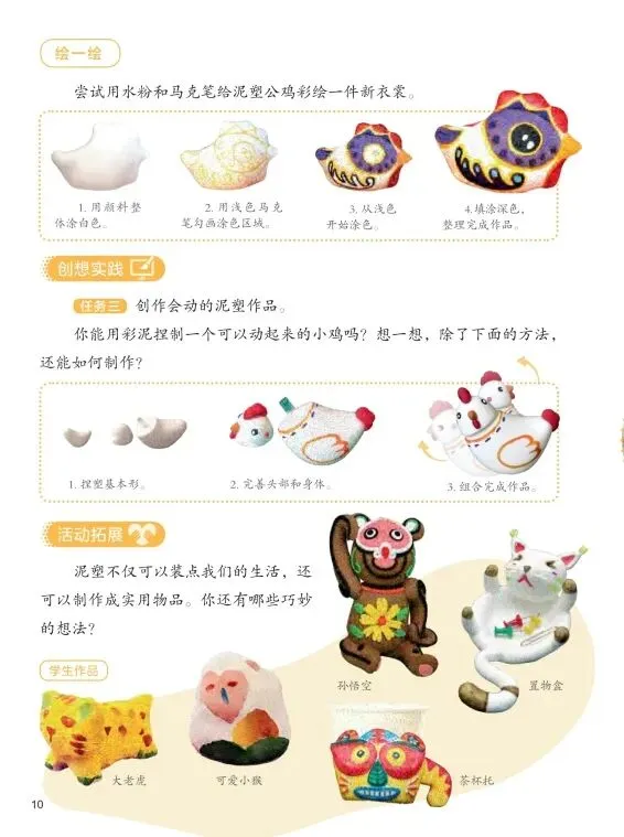 任务三:创作会动的泥塑作品。 引导学生思考如何让泥塑动起来,比如插上牙签、羽毛,或者做成关节可动的玩偶。