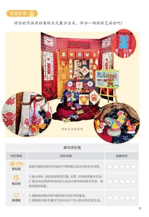 单元长作业/检测: 完成一份《我是民艺小传人》手册,包含:我最喜欢的一件民间美术作品介绍(附图片或临摹)、我的剪纸/泥塑创作思路、我想用民间艺术美化生活的一个小点子。