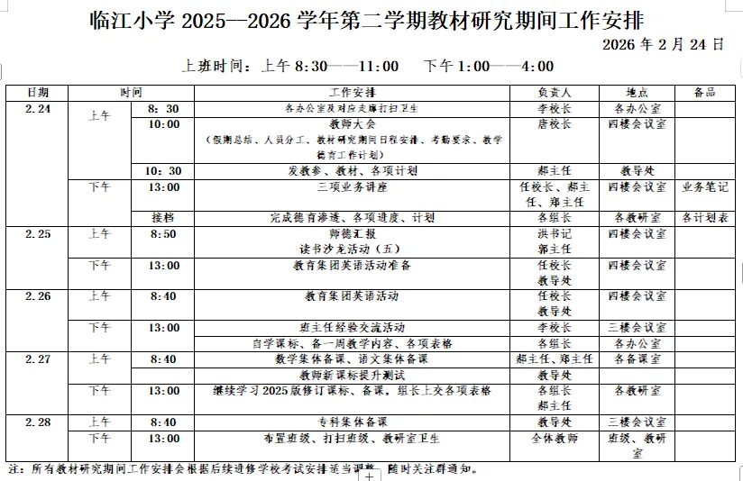 春寒料峭,掩不住临江人教研的热情;学期伊始,吹响了新征程奋进的号角。2026年2月24日至28日,临江小学开展了为期五天的春季学期教材研究系列活动。从顶层设计到课堂落地,从师德涵养到专业提升,全体教师以研促教、以教启思,在充实而有序的节奏中,为新学期蓄力赋能。