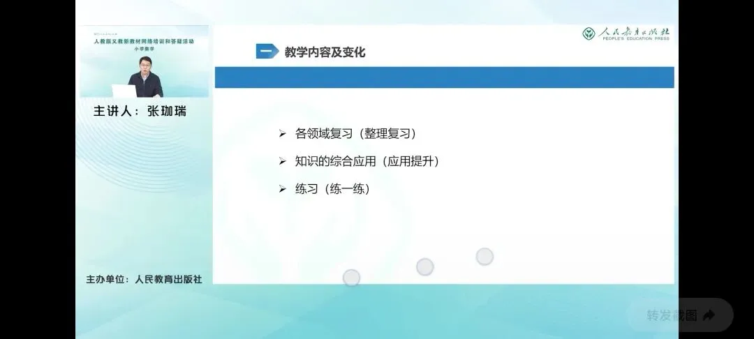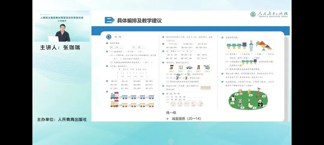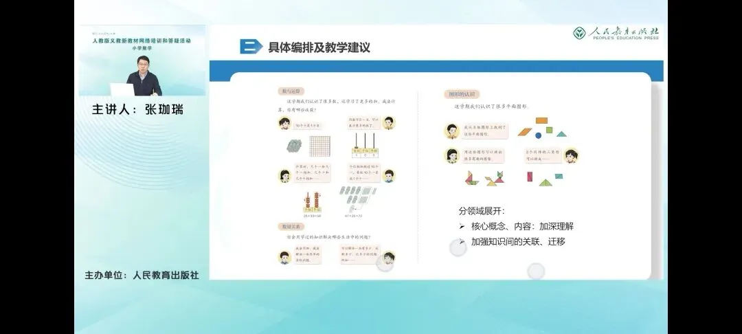 教材继续使用了学生整理知识图的形式来进行表达择要体现了学生在本学期学习的主要内容,包括100以内数的认识、100以内的加减法和数量间的加减关系三部分内容。在树的认识板块主要强调了树的组成与表达,突出了对技术单位百的认识。在数的运算板块依旧通过加减法对照的方式,体现了基于相同技术单位个数累加和累减的运算一致性,勾连了数概念与运算之间的本质联系。而数量关系内容的复习给出了用长条图表征的一组数量关系。这里是求比一个数少几的数是多少的问题,这也是相差关系学习中的一个难点。本册教材还包含了平面图形和人民币的相关认识,教材并没有作为重点呈现,但在学生自主整理知识图的过程中,也要鼓励学生尽可能全面的复习所学知识,通过整理逐步构建完整的知识结构。 在梳理知识图的基础上,教材又分三个主题回顾了本册教材的相关内容,呈现的内容在知识图的基础上,进一步丰富数的认识板块,包括计数单位摆的产生过程,突出了这种计数单位之间的实际关系。帮助学生体会数位和数位上的数,表达不同计数单位个数的优越性,使学生进一步体会十进位制的思想。而数的运算着重通过直观方式体现数概念与数运算的一致性,借助计数器凸显了计算时相同数位上的珠子,或者说相同数位上的数相加减,体现相同计数单位的个数相加减的计算本质。而借助小棒体现了进位加法中个位相加满十向十位进一的技术单位的转化过程,引导学生进一步体会数语运算的一致性。而数量关系呢,包括对用加减法解决的实际问题的回顾,通过学生视角对加减法问题的介绍,让学生感受到这么多的不同类型的问题都可以用加减法解决。就是因为这些问题中的数量之间都存在着相同的关系,从而体会这些问题的共性,发展模型意识。要需要注意的是,这里从通过学生视角对加减法问题的分类,只是一种示范,并不是对这些问题起了名称。学生只要能用自己的语言表达清楚就可以。 而第三个板块对图形认识的复习则指向了认识平面图形的主要内容。能够辨认基本的平面图形,能直观描述平面图形的特征,以及用简单的图形拼图。同时以操作活动进行复习,可以让学生进一步积累活动经验,激发学习的兴趣。