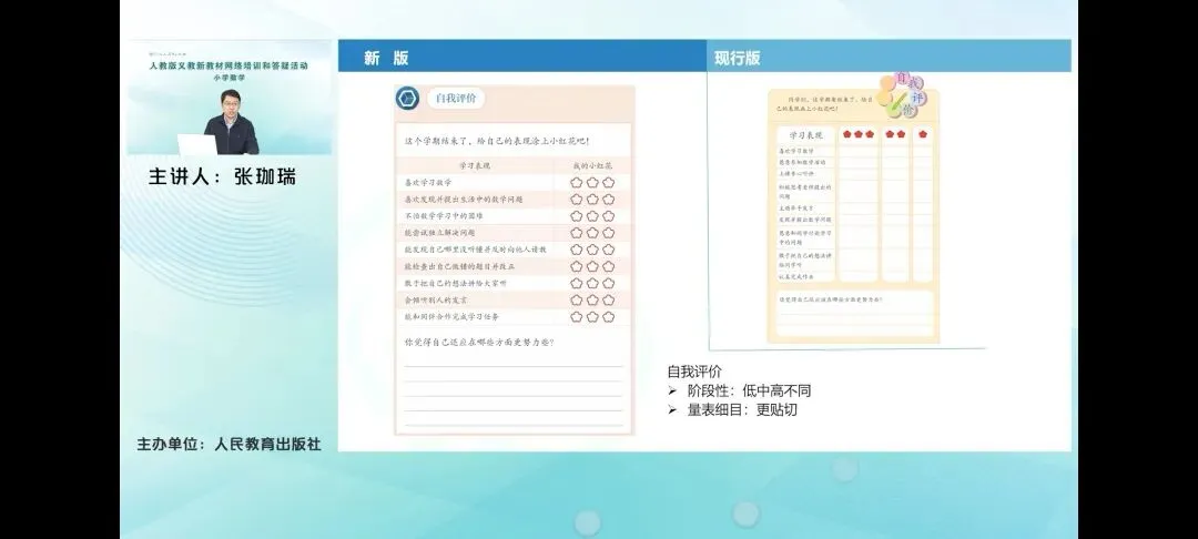 教材在应用提升板块安排了体现知识综合性和关联性的三道练习题,指向知识的综合应用。比如第一题就将数的认识和数的运算结和百数表联合呈现,帮助学生在从认识数到数的计算到总结100以内加减法计算方法和注意事项的过程中,体会这种数认识与运算之间的联系。第二题安排了同一个情境下三个相差关系的不同问题,并且让学生画图比较三个问题中数量关系之间的联系。这里学生可以通过画长条图的形式直观的感知到三个问题。画出的长条图的图是它在基本的结构上都是一样的,只是条件和问题所对应的位置或者说所对应的量发生了调换,进一步的感受这种相差关系问题之间的联系。第三题是图形与几何的应用提升。一方面让学生通过用四个小正方形拼图形,回顾图形拼组的知识。另一方面也发展学生的创新意识,让学生尝试用学过的图形拼出有趣的图案。和一年级上册的类似,总复习中的练习题目也体现了减量题质的编排特点。从原教材中的20道练习题减少为了新教材中的十四道练习题。那么在具体的练习上,主要是削减了一些机械重复性的练习。对一些练习紧密的练习则进行了整合排布,减少学生的学习负担。 和一年级上册的类似,总复习中的练习题目也体现了减量题质的编排特点。从原教材中的20道练习题减少为了新教材中的十四道练习题。那么在具体的练习上,主要是削减了一些机械重复性的练习。对一些练习紧密的练习则进行了整合排布,减少学生的学习负担。 本册教材在最后也安排了自我评价的内容,这与一年级上册的自我评价是一样的。新教材将自我评价的内容以学段形式分低中高做出了区别,使得这个评价量表的细目更加贴合于所在学段的学生情况。以上就是本册教材的各单元的具体编排情况。