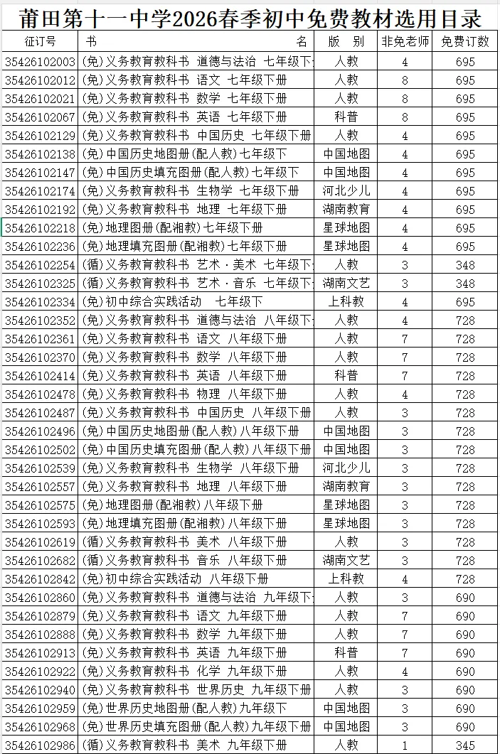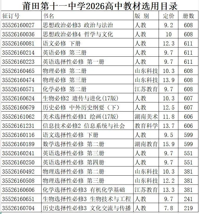为进一步规范教学用书管理,我校严格依据莆田市教育局公布的《莆田市2026年春季学期高中教材选用目录》选用教材。现将2026年春季我校各年级、各学科的教材目录、版本等信息公示如下: