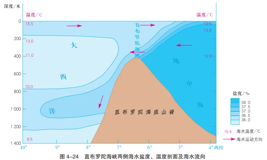 地中海因蒸发旺盛,海水盐度高、密度大。高盐度、高密度的海水下沉,由直布罗陀海峡底层流向大西洋。而相邻的大西洋海水的盐度比地中海低、密度小,水面比地中海高,于是大西洋表层海水经直布罗陀海峡流入地中海,补充地中海海水的缺失。
