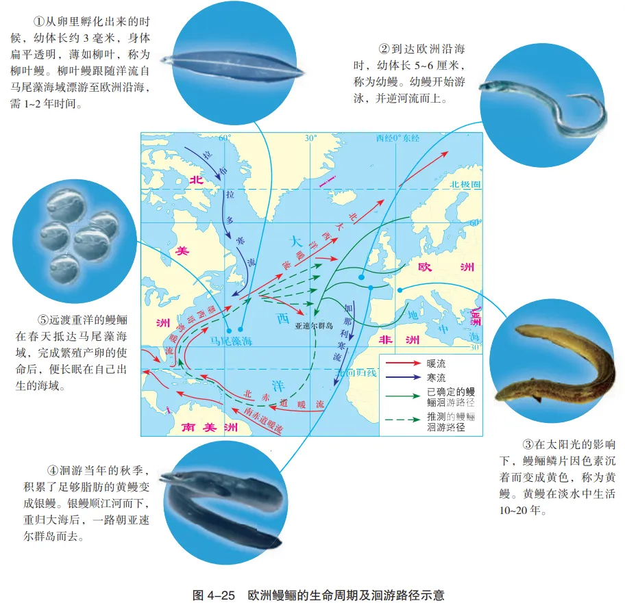 3.欧洲鳗鲡在欧洲的河湖里生活10多年之后,将横渡大西洋,长途跋涉回到繁殖地马尾藻海域产卵。长久以来,鳗鲡的洄游路径一直是个谜。2017年初,科研人员揭晓了部分谜底。读图4-25,完成相关任务。