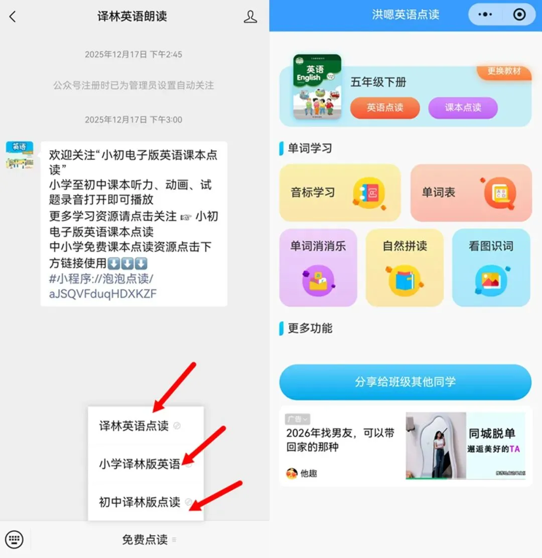 关注领取英语教材电子课本步骤1:点击关注下方公众号步骤2:消息框内点击关键词“英语点读”获取免费点读工具2026新教材英语译林版七年级下册电子课本+课文音频+单词表【完整高清版】声明:本公众号部分转载的文章、图文、视频来自网络,其版权和文责属原作者所有,若来源标注错误或侵犯到您的权益,烦请告知 ,我们将立即删除。