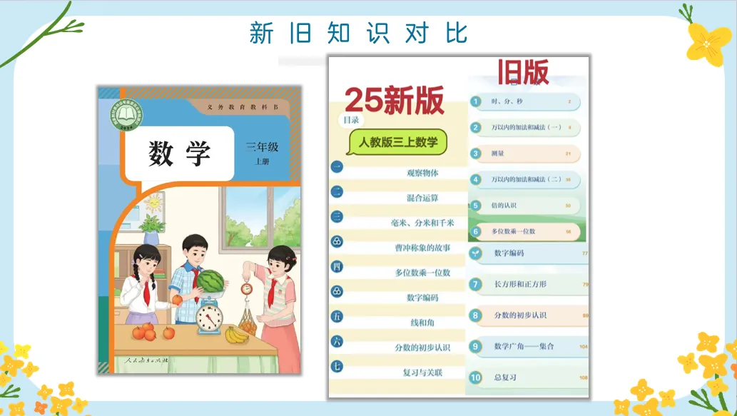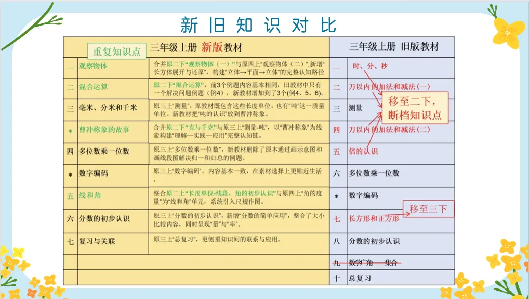 猛然一看,内容像是减少了,但纵向来看整个二三年级人教版数学教材的改版,会发现内容的知识点上更加正整合,线性呈现。