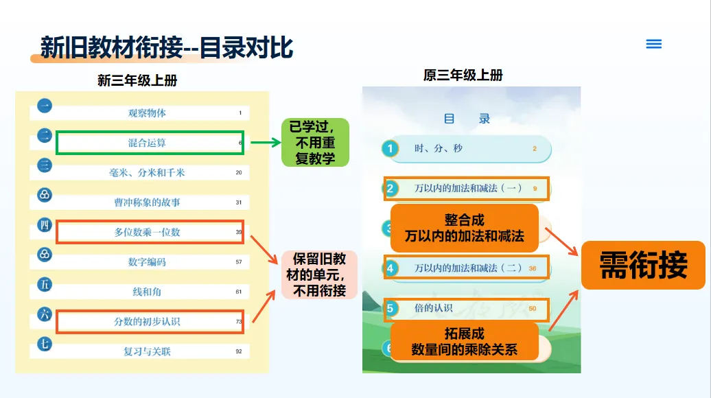 再来看三年级目录,“多位数乘一位数”和“分数的初步认识”是保留单元,不用衔接。