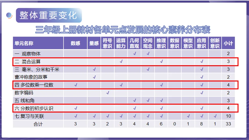 每个单元的核心素养,在混合运算单元有3个,分别是运算能力、推理意识、应用意识。在多位数乘一位数单元有4个,分别是数感、运算能力、推理意识、应用意识。在分数的初步认识单元有4个,数感、几何直观、推理意识、应用意识,共计11个。