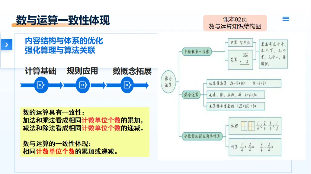 突出计算基础、规则应用到数概念拓展,体现数与运算的一致性,也就是加法和乘法看成相同计数单位个数的累加,减法和除法看成相同计数单位个数的递减。