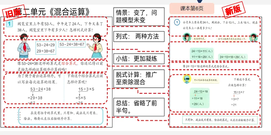 再看《混合运算》这一单元,在课本第6页的例1中,我们发现不变的是编排的结构、方法的梳理、规律的总结。
