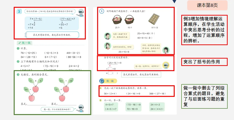 以机器人的发问,总结有括号的计算规则,经过例题的探究帮助学生深入理解括号的意义,原教材开门见山给出计算题的计算方法。