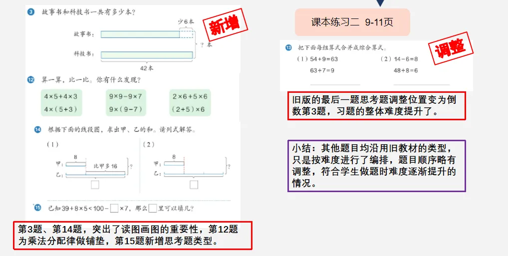 在对应的练习中。题型增加,注重画图理解能力,通过算、比、观察、发现的设问,为乘法分配律做铺垫,综合考察孩子对运算顺序的灵活应用。