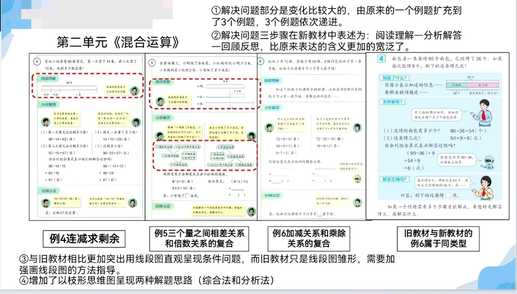 比如,旧教材第二单元的《混合运算》只有一个例题——借助长条图解决多部计算的数学问题。