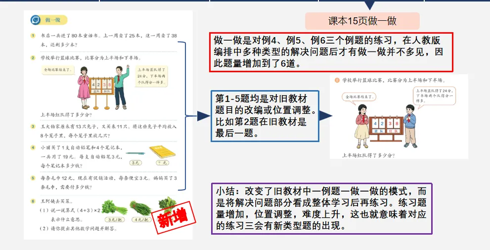从三个例题中可以发现,新教材对解决问题的改变是非常大的,增加了题型、增加了解题方法、使得数学理解更为深入,从根本上培养孩子数学思维。