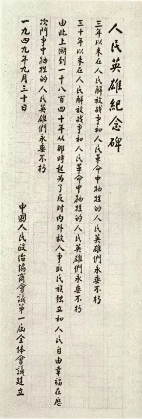 人民政协第一次会议正式结束,决定在天安门广场修建一座纪念碑,