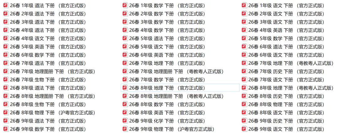 4、本学期绝大多数教材均有更新,其中小学二三年级的语数、四年级英语和初中八年级全科是大改版,其余科目多少都有订正,这次获取到官方最终版,跟正式出版物一致。