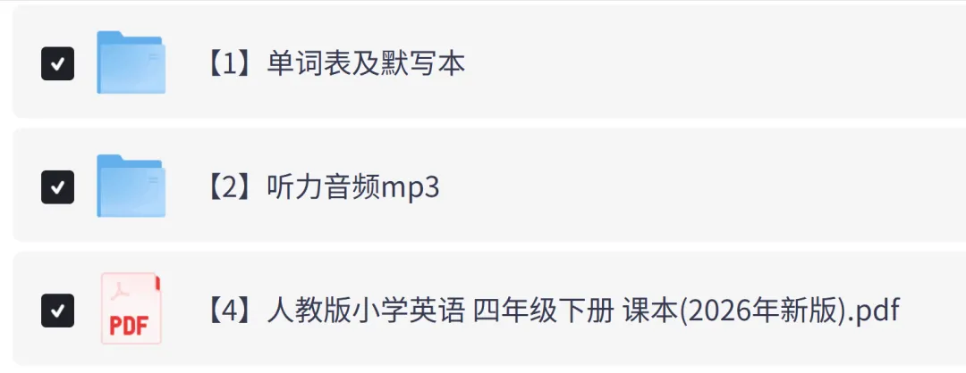 人教版初中英语四年级下册电子课本教材+单词表+单词默写表+听力音频完整版(2026年新版教材),可下载打印!