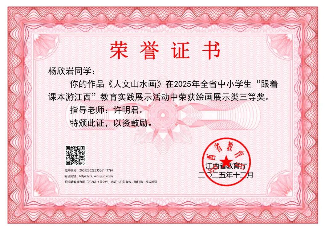 近日,江西省教育厅办公室正式公布2025年全省中小学生“跟着课本游江西”教育实践展示活动获奖名单,九江市九江小学杨欣岩同学凭借作品《人文山水画》在众多参赛作品中脱颖而出,成功斩获绘画展示类三等奖,为学校赢得荣誉。
