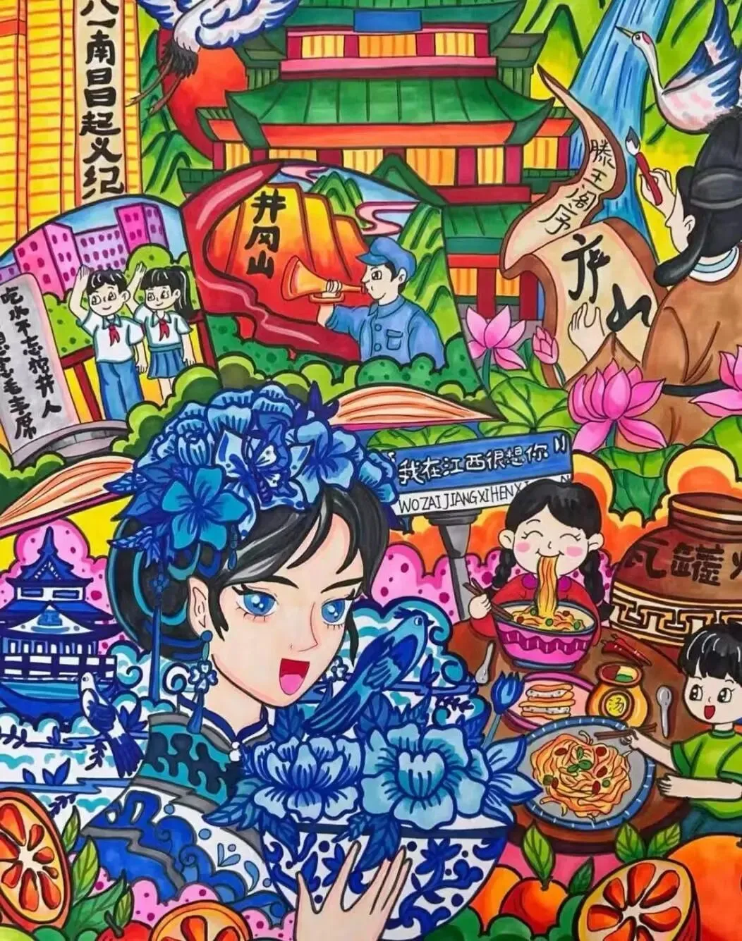 杨欣岩同学的参赛作品《人文山水画》,巧妙地将江西的人文底蕴与自然山水相融合。作品以细腻的笔触勾勒出江西独特的地域风貌,既体现了课本中蕴含的江西文化元素,又融入了少年视角下对家乡山水的热爱与感悟,充分契合了“跟着课本游江西”活动“让课本知识走进现实、让家乡情怀扎根心中”的核心宗旨。