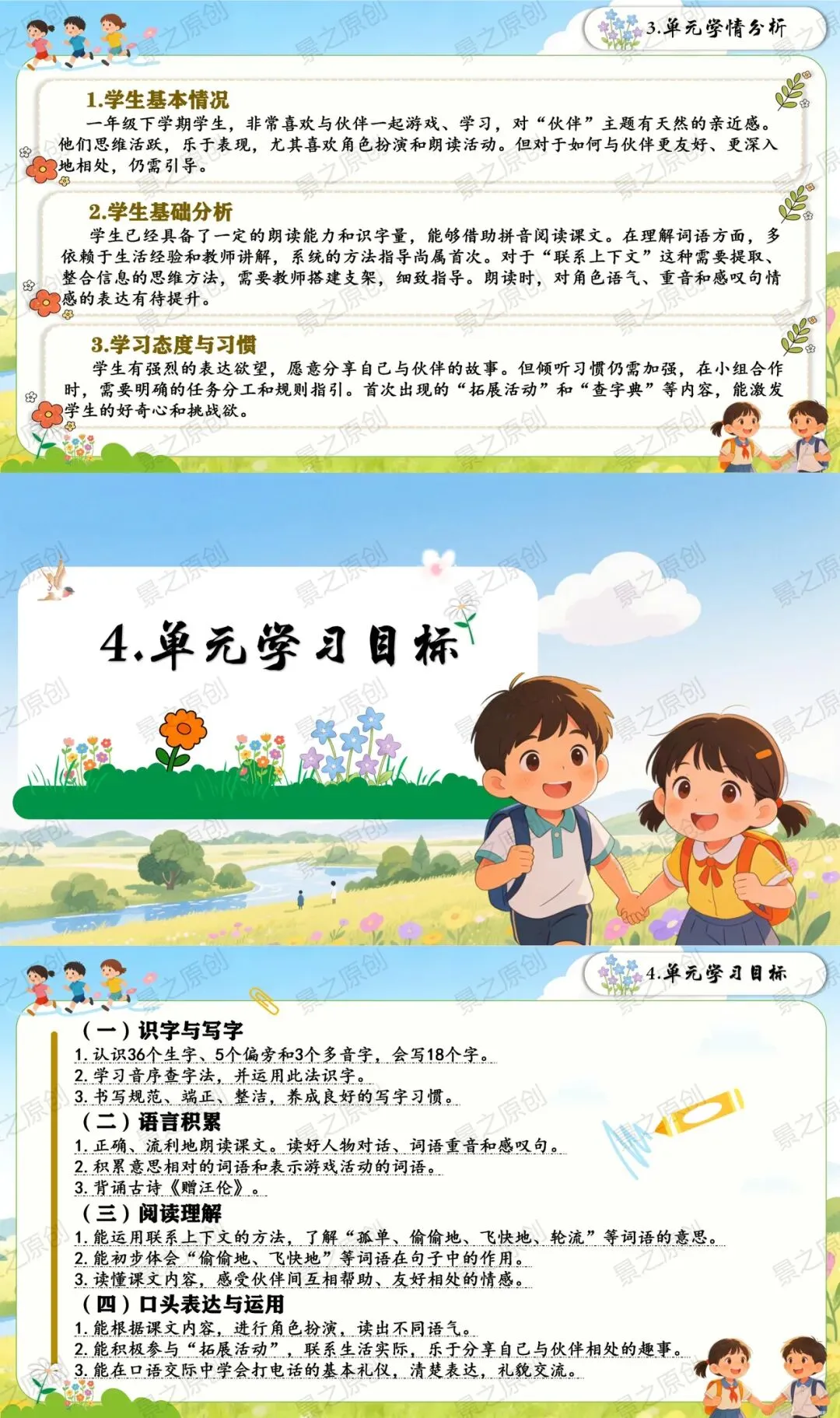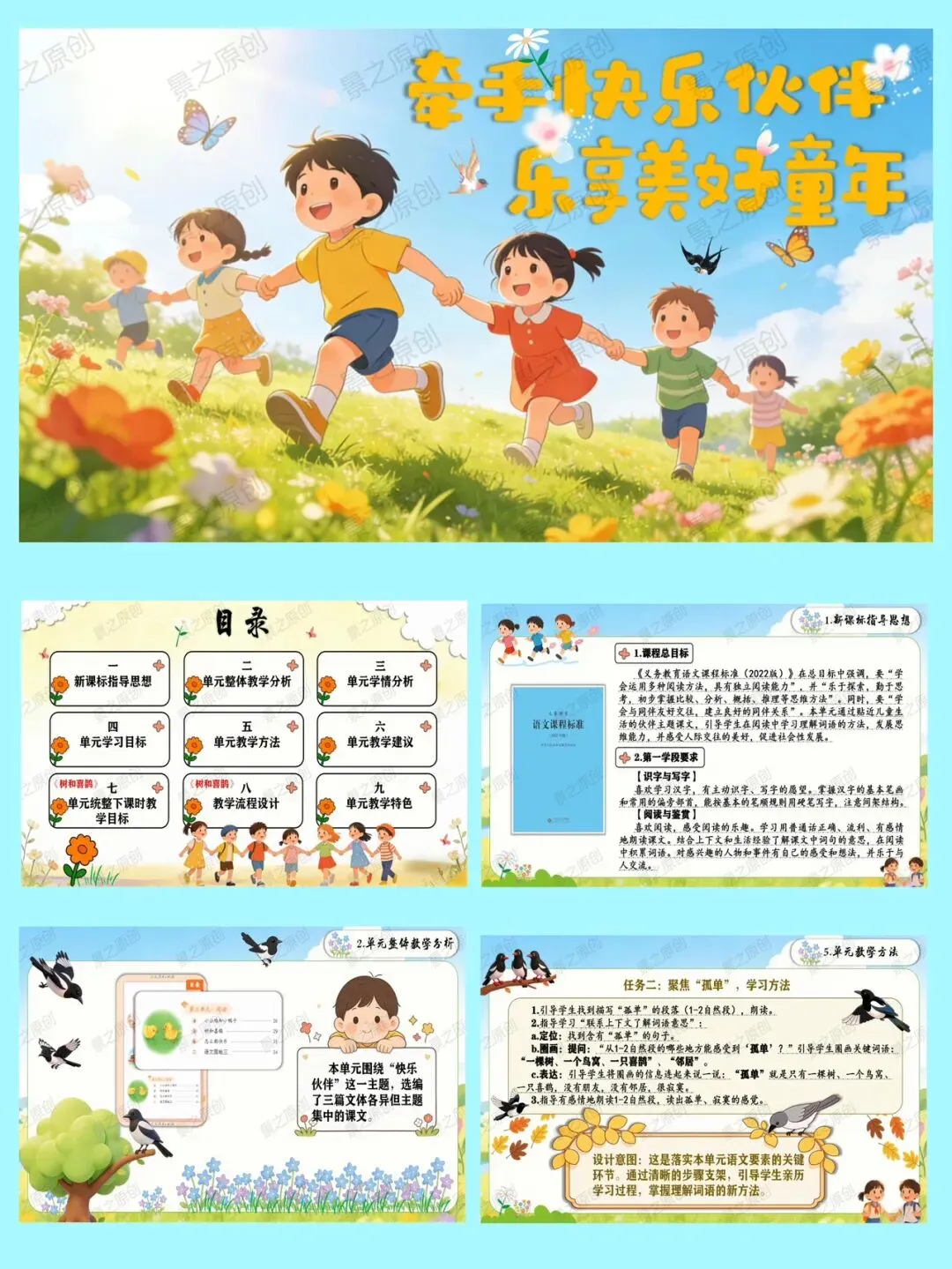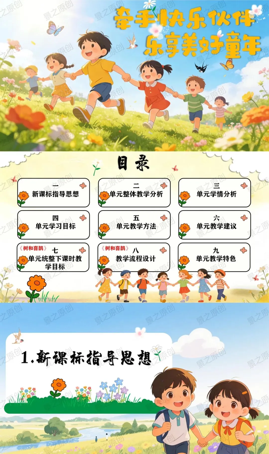 ✨我将以“牵手快乐伙伴,乐享美好童年”为主题,从新课标指导思想、单元整体教学分析、学情分析、教学目标、教学方法、教学建议及具体课例等方面展开说课。
