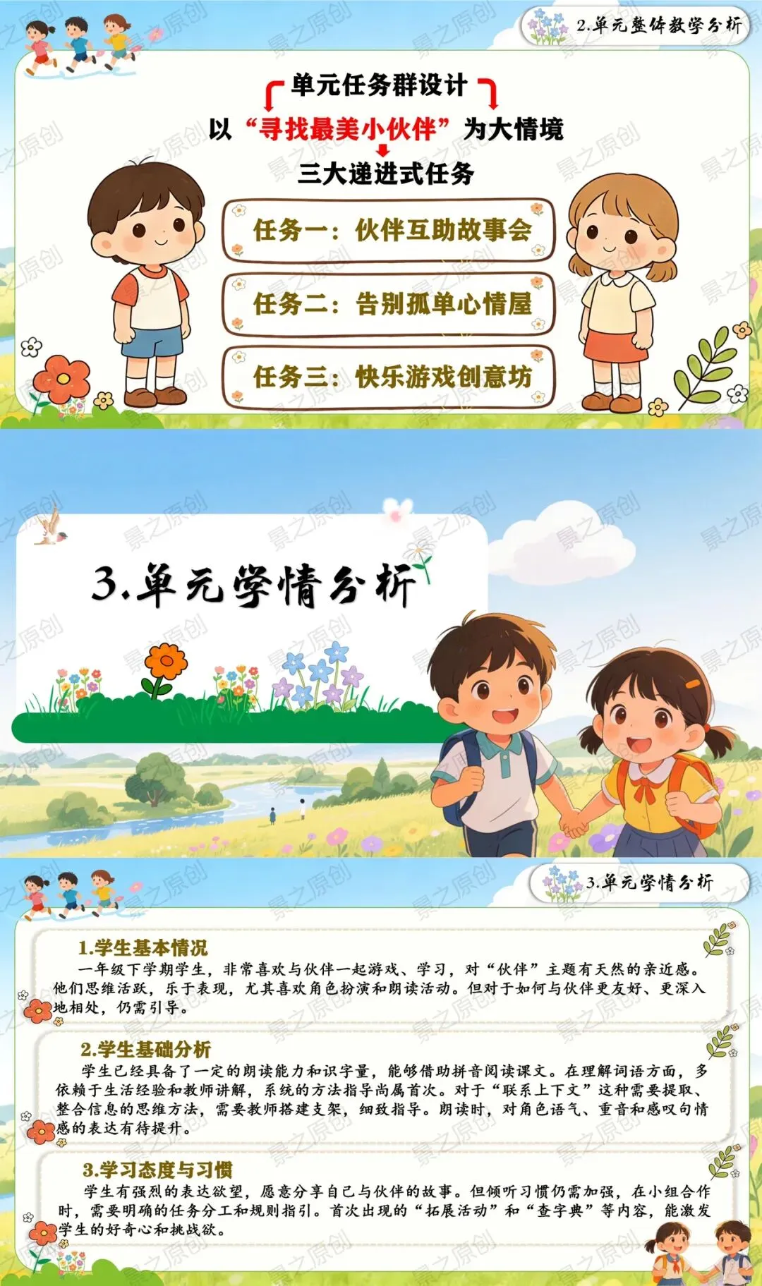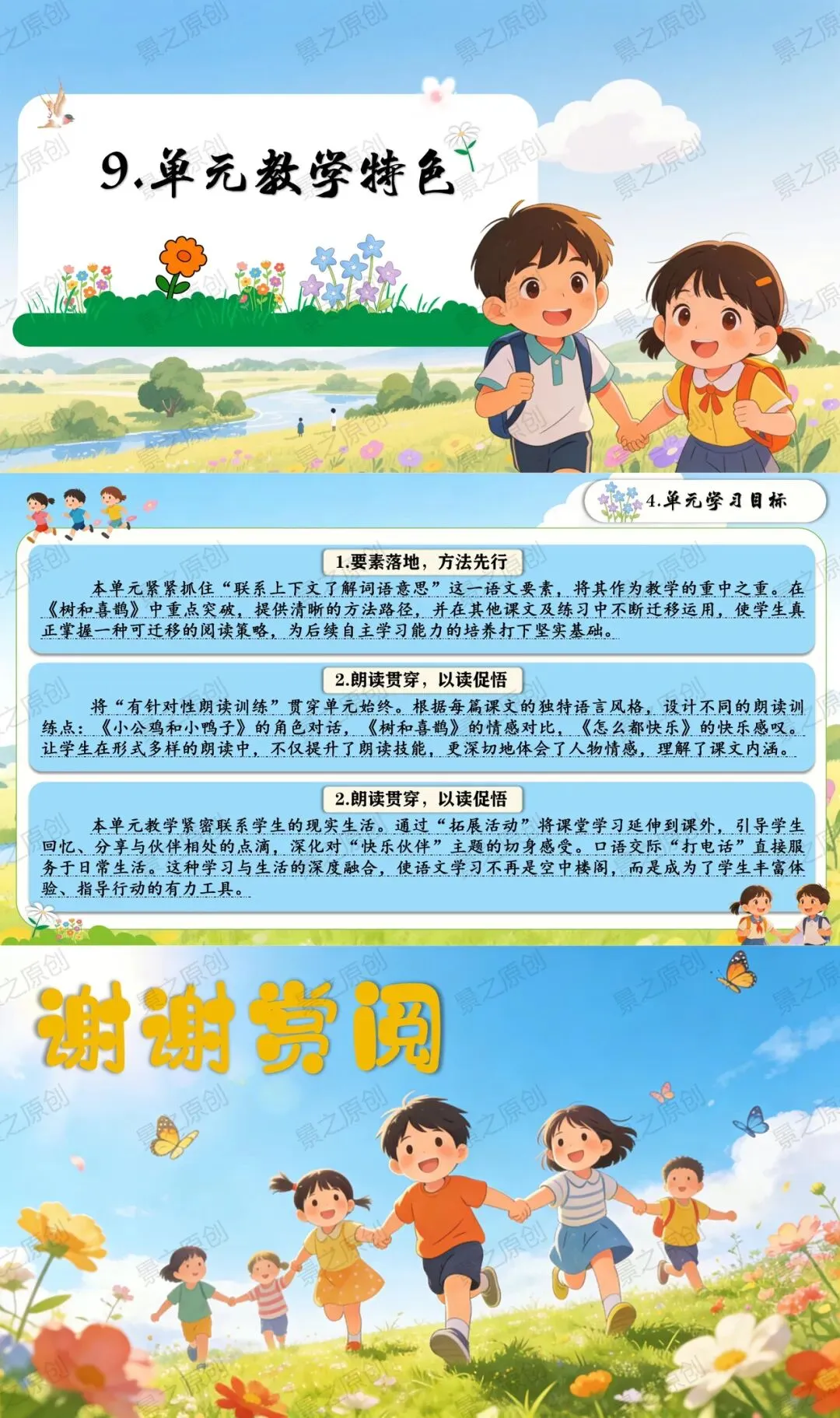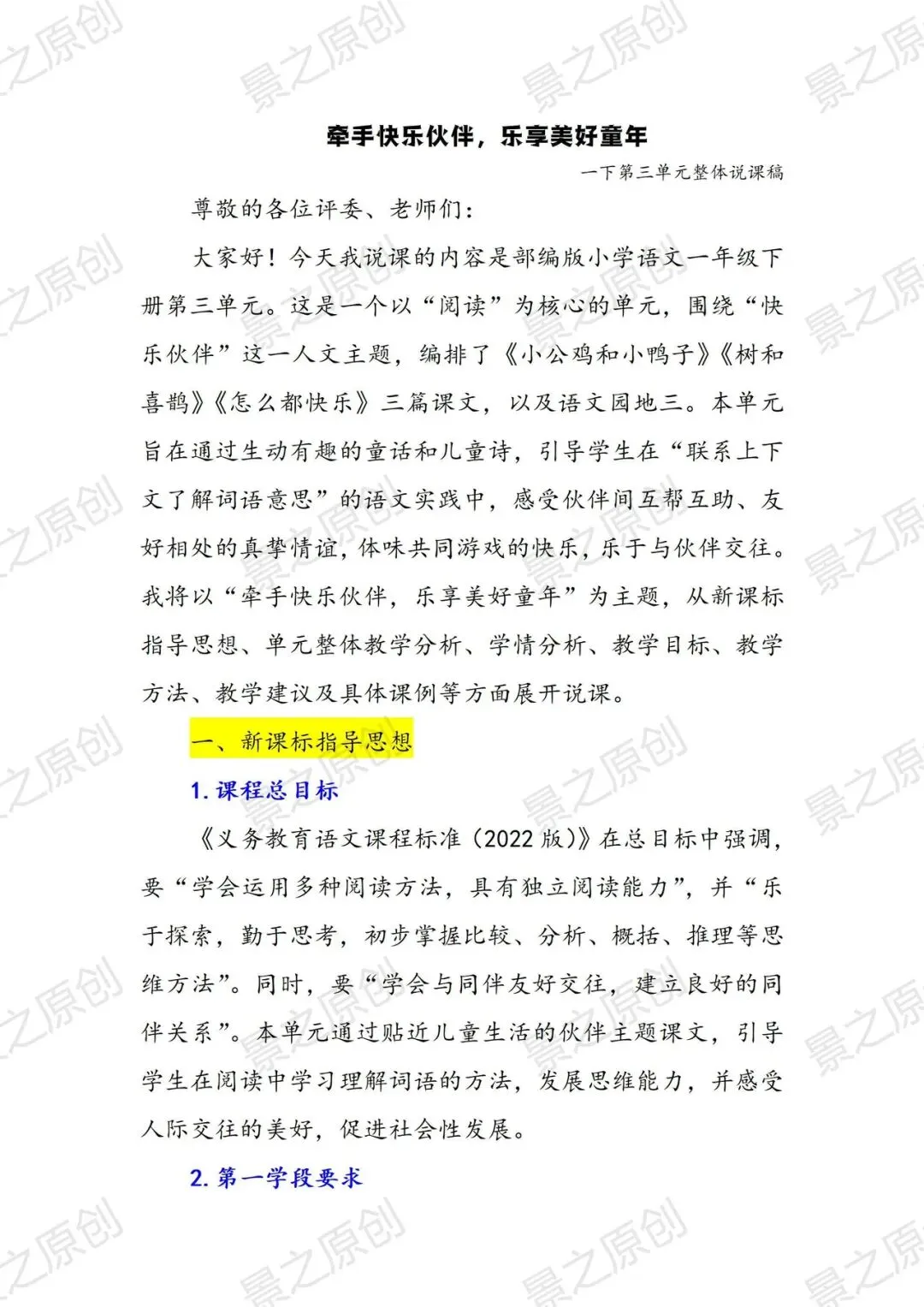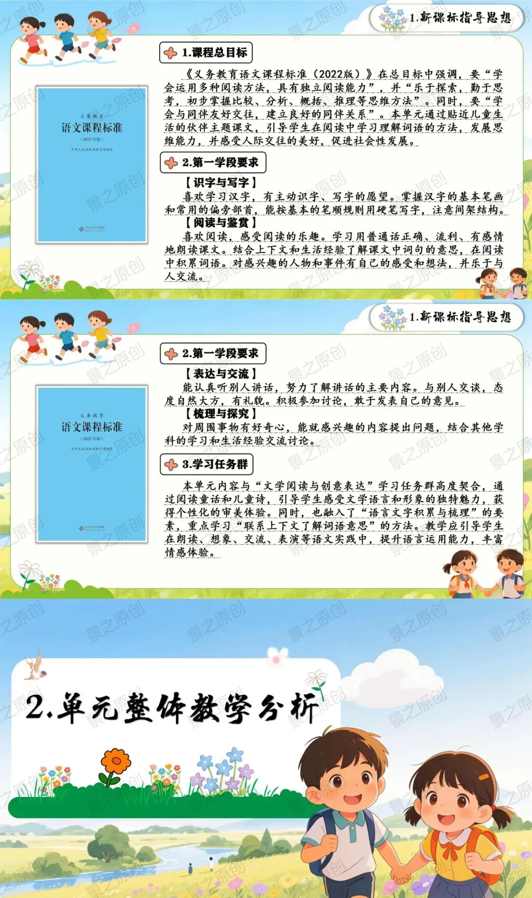 ✨我将以“牵手快乐伙伴,乐享美好童年”为主题,从新课标指导思想、单元整体教学分析、学情分析、教学目标、教学方法、教学建议及具体课例等方面展开说课。