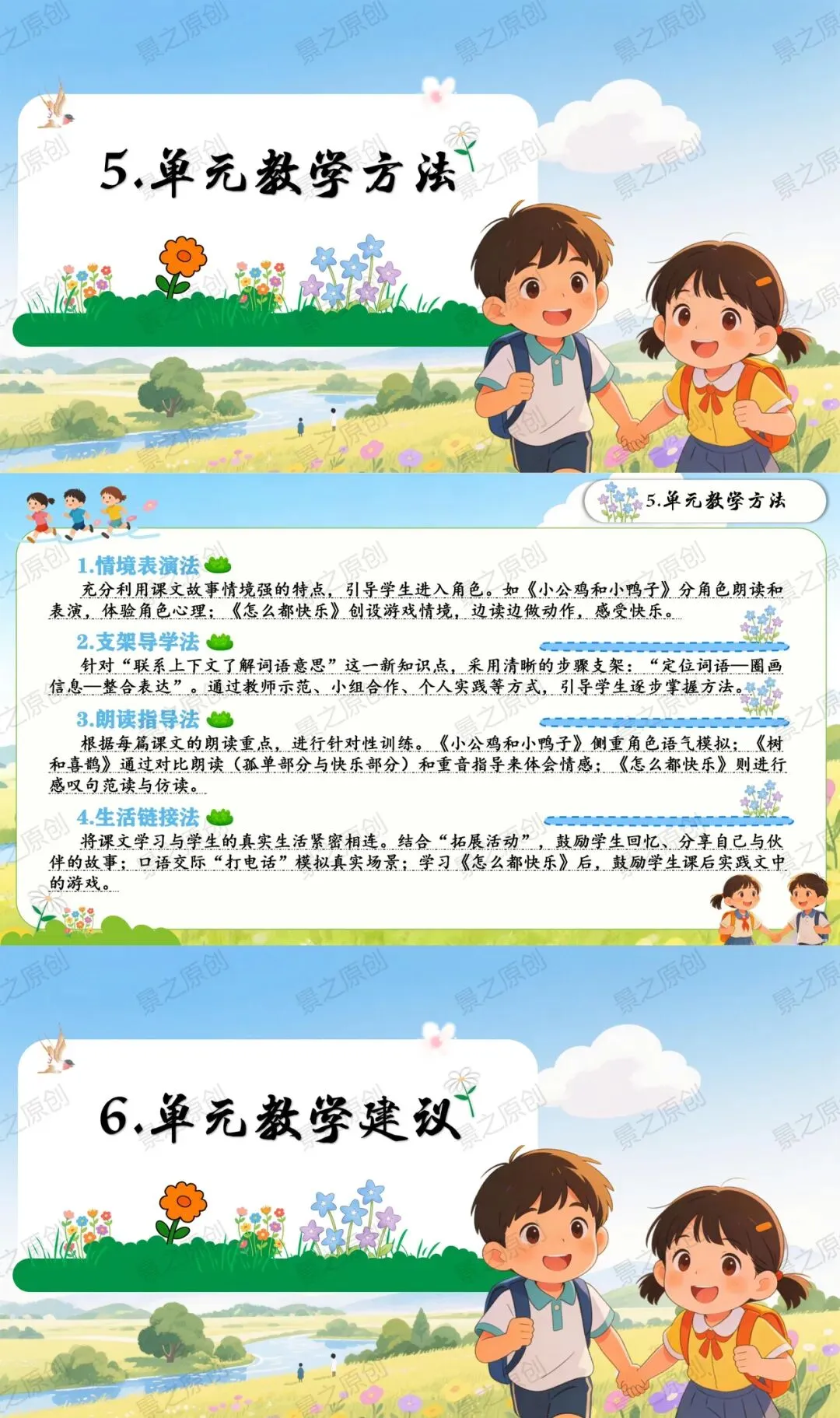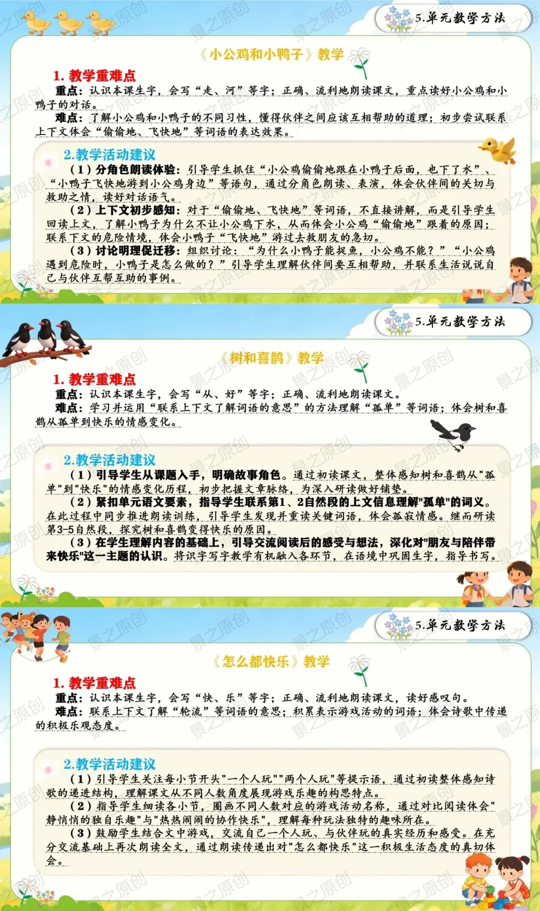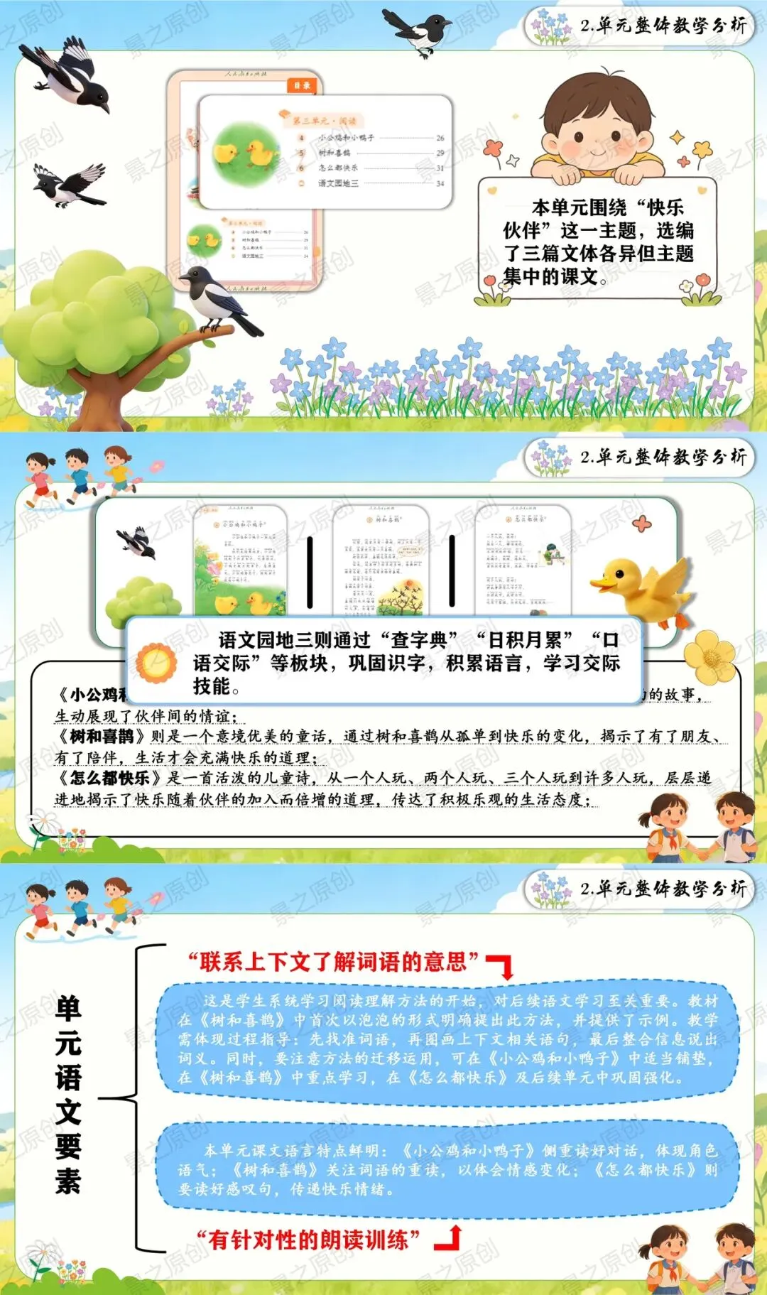🧩本单元围绕“快乐伙伴”这一主题,选编了三篇文体各异但主题集中的课文。《小公鸡和小鸭子》是一篇充满童趣的童话,通过小公鸡和小鸭子一起玩、互相帮助的故事,生动展现了伙伴间的情谊;《树和喜鹊》则是一个意境优美的童话,通过树和喜鹊从孤单到快乐的变化,揭示了有了朋友、有了陪伴,生活才会充满快乐的道理;《怎么都快乐》是一首活泼的儿童诗,从一个人玩、两个人玩、三个人玩到许多人玩,层层递进地揭示了快乐随着伙伴的加入而倍增的道理,传达了积极乐观的生活态度。三篇课文从不同角度,潜移默化地引导学生体会伙伴的重要性。语文园地三则通过“查字典”“日积月累”“口语交际”等板块,巩固识字,积累语言,学习交际技能。