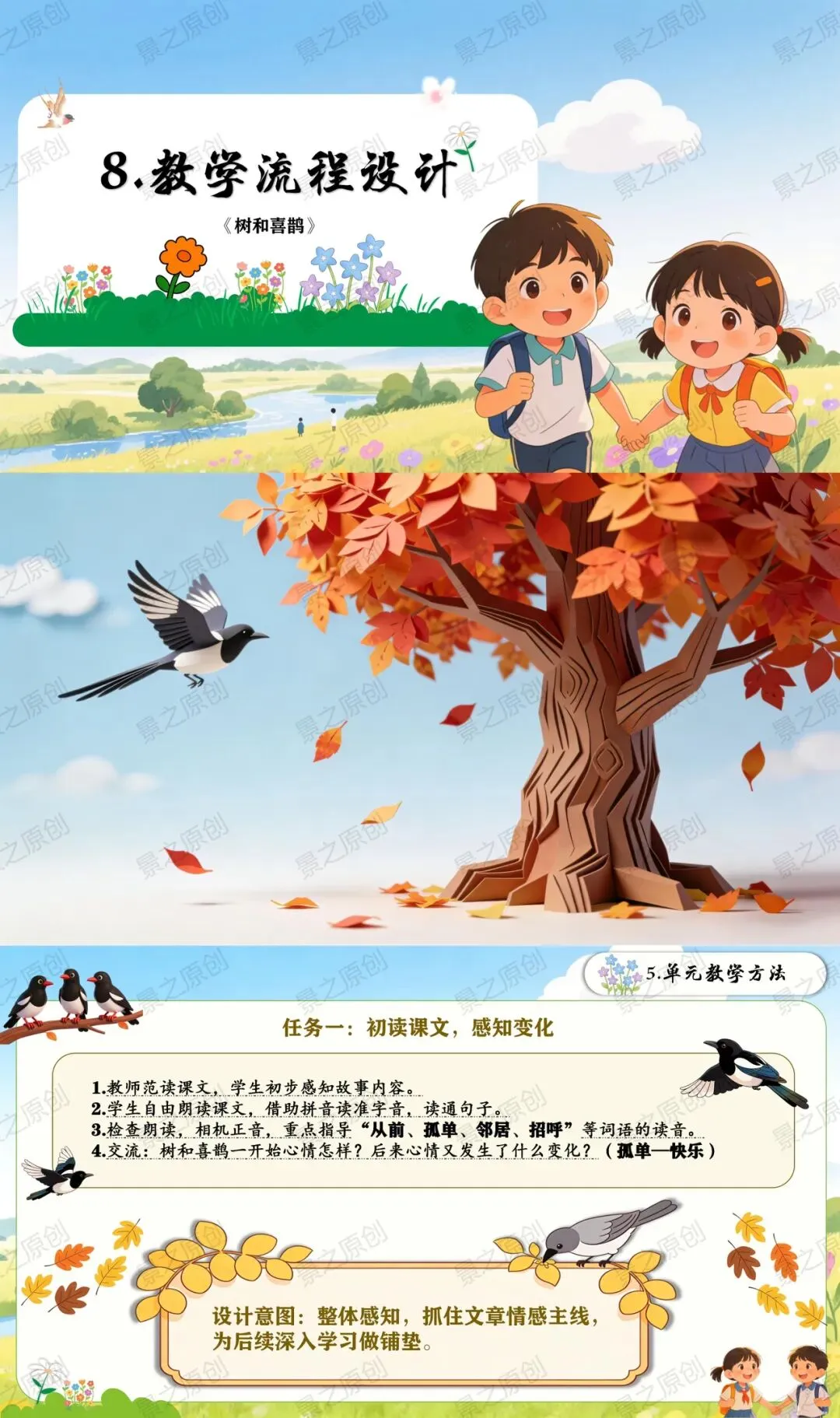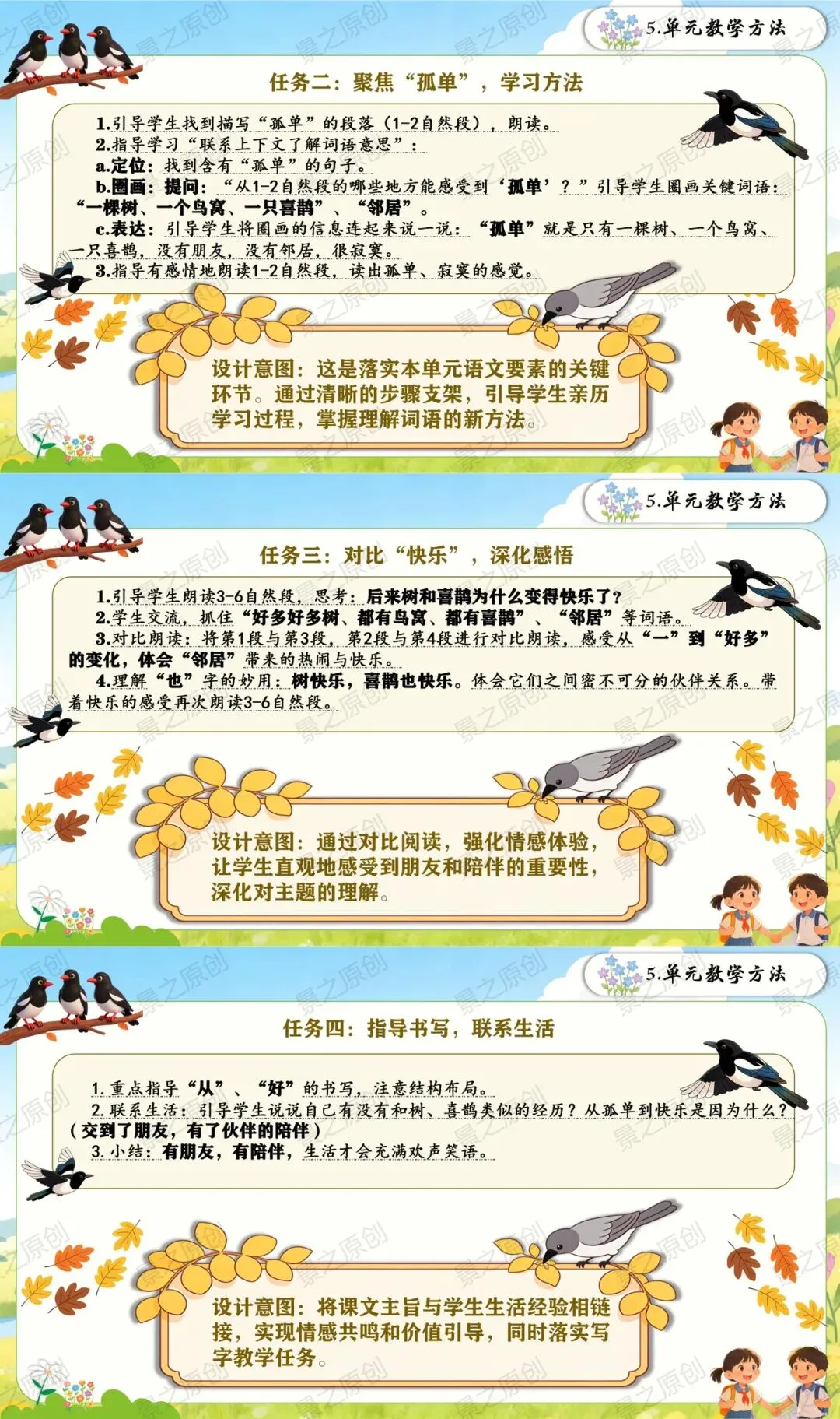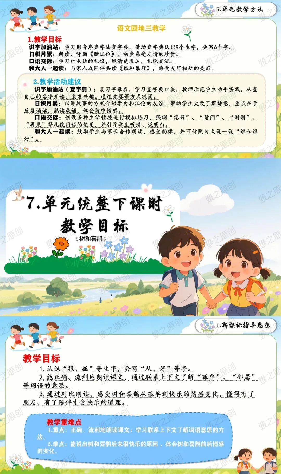 🧩本单元围绕“快乐伙伴”这一主题,选编了三篇文体各异但主题集中的课文。《小公鸡和小鸭子》是一篇充满童趣的童话,通过小公鸡和小鸭子一起玩、互相帮助的故事,生动展现了伙伴间的情谊;《树和喜鹊》则是一个意境优美的童话,通过树和喜鹊从孤单到快乐的变化,揭示了有了朋友、有了陪伴,生活才会充满快乐的道理;《怎么都快乐》是一首活泼的儿童诗,从一个人玩、两个人玩、三个人玩到许多人玩,层层递进地揭示了快乐随着伙伴的加入而倍增的道理,传达了积极乐观的生活态度。三篇课文从不同角度,潜移默化地引导学生体会伙伴的重要性。语文园地三则通过“查字典”“日积月累”“口语交际”等板块,巩固识字,积累语言,学习交际技能。