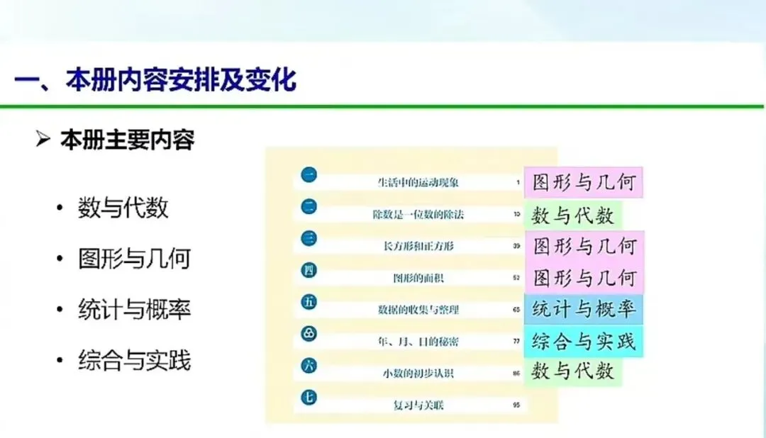 在“数与代数”领域,数的认识和运算的内容为小数的初步认识和除数是一位数的除法两个单元。在“图形与几何”领域,图形的位置和运动部分安排了生活中的运动现象一个单元。“图形的认识和测量”部分安排了长方形和正方形和图形的面积两个单元。数据的收集与整理单元是“统计与概率”领域的内容。在“综合与实践”领域安排了年月日的秘密的主题活动。在复习与关联中,还安排了拓展内容,数学广角重叠问题。