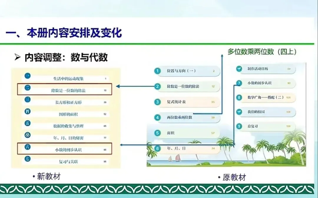 从目录中可以看出,新教材和现行教材相比,教材调整了部分内容的设置,目的是使知识更加结构化。这也是本次新课程标准的要求。数与代数原来有三个单元,包括小数的初步认识、除数是一位数的除法、两位数乘两位数,目前调整为小数的初步认识和除数是一位数的除法两个单元,两位数乘两位数移动四年级上册合并成为多位数乘两位数。经过调整,计算部分:三年级主要是一位数乘除多位数,四年级主要是两位数乘除多位数。