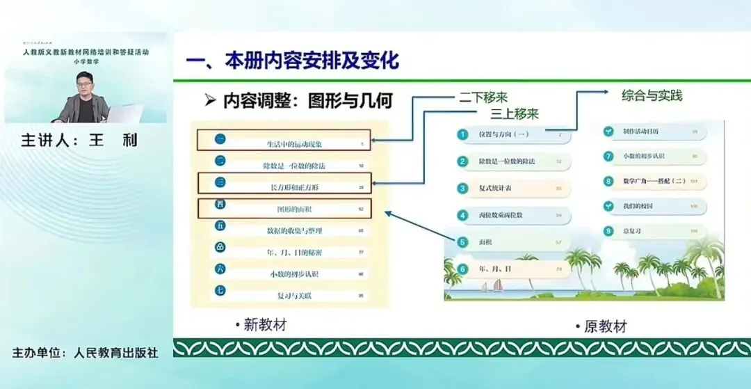 图形和几何部分,图形的认识和测量,把长方形和正方形这一单元从三年级上册移来。图形的位置和运动,把位置与方向单元分拆成两个综合实践,分别放在二年级上册和四年级上册。本册教材这一次加入了一个图形运动单元:生活中的运动现象,这个是从二年级下册移来的。