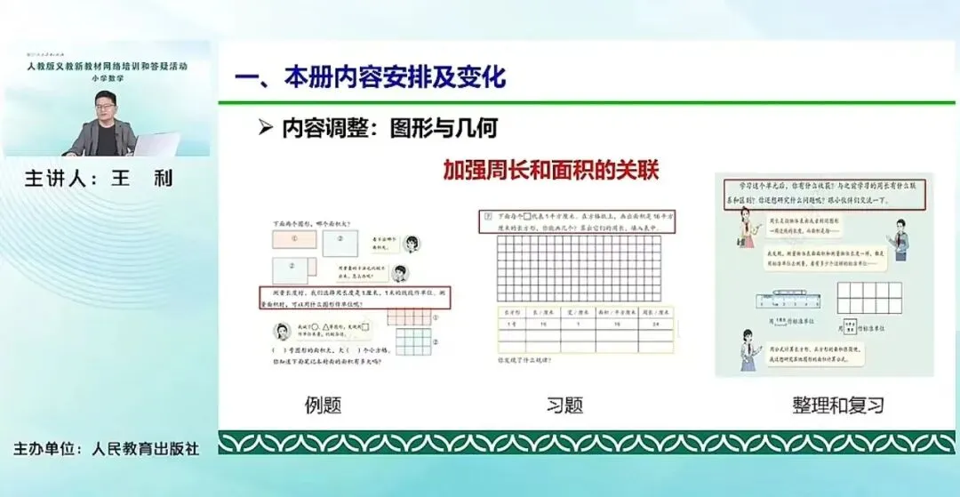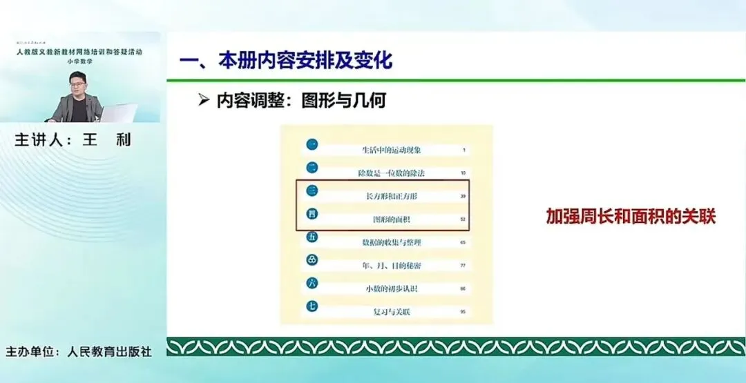 另外我们发现这次教材修改,特意把周长和面积调解成前后相连的两个单元。原因主要有两个。一是从数学知识的角度来看,周长和面积是几何度量中的基本元素,分别量化图形的外边缘长度和内部区域的大小。这两个概念虽然代表了不同的几何属性,但它们之间存在着紧密的内在联系。二是从本质上讲,周长和面积都采用了统一的度量方式,即通过计算图形包含的基本单位数量,来表达图形的尺寸。周长是通过累加图形边界上一维的基本单位,即长度单位得到的。而面积是通过累加覆盖图形的二维基本单位,通常是小正方形单位来计算的。基于上面两点的考虑,把周长和面积集中编排。