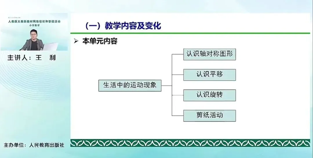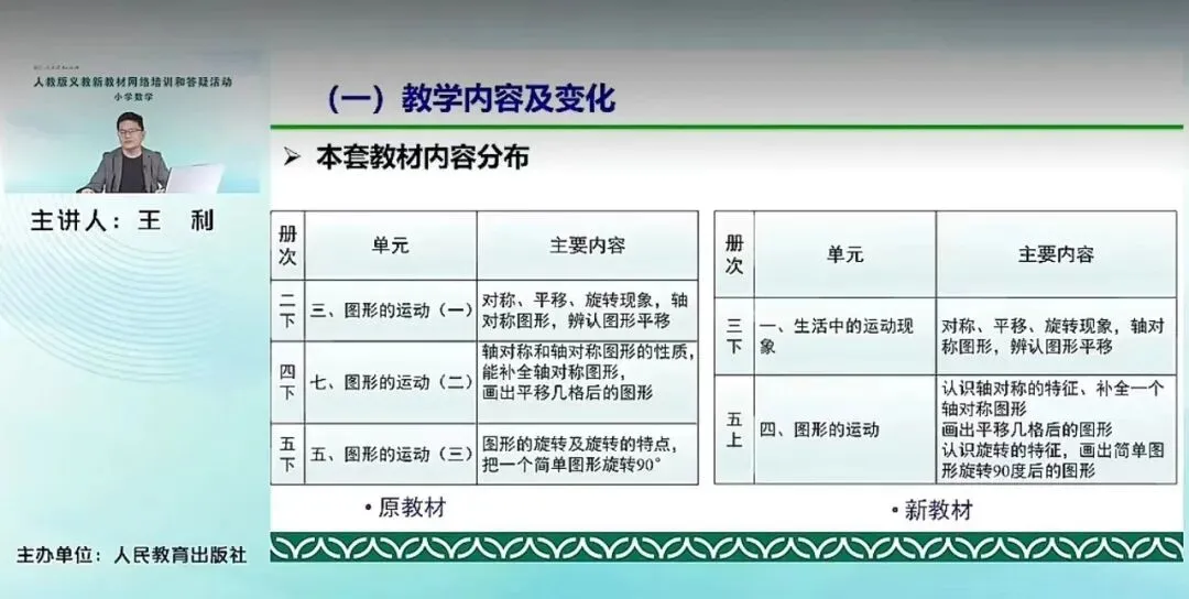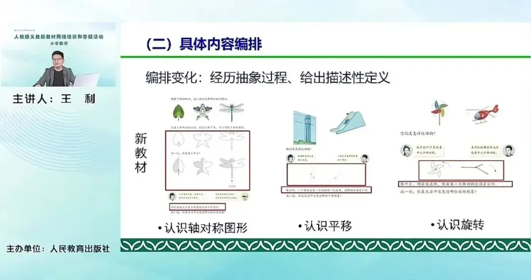 在原教材中,图形的运动分为三段。其中图形的运动一是认识生活中的运动现象,图形的运动二是轴对称和平移,图形的运动三是旋转。图形的运动2和运动3,它们是从数学本质的角度再次认识运动现象。这次修改,根据课标的要求,认识生活中的运动现象,移到本册,而把四下和五下的图形运动二和图形运动三整合成一个单元。安排在五上。教材通过整体的调整,旨在让学生完成对轴对称图形、平移、旋转,知识的进阶和思维发展,落实核心素养。