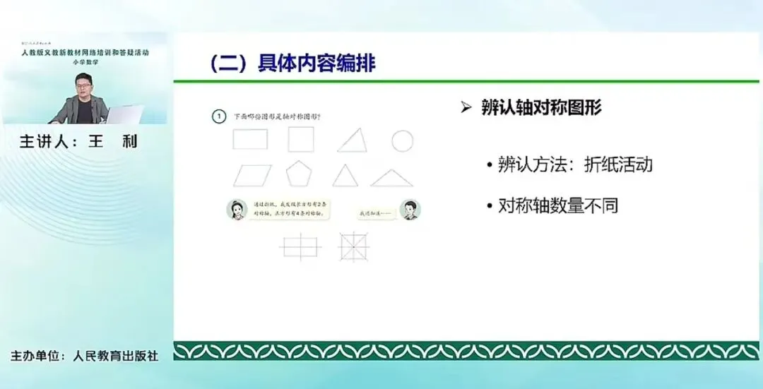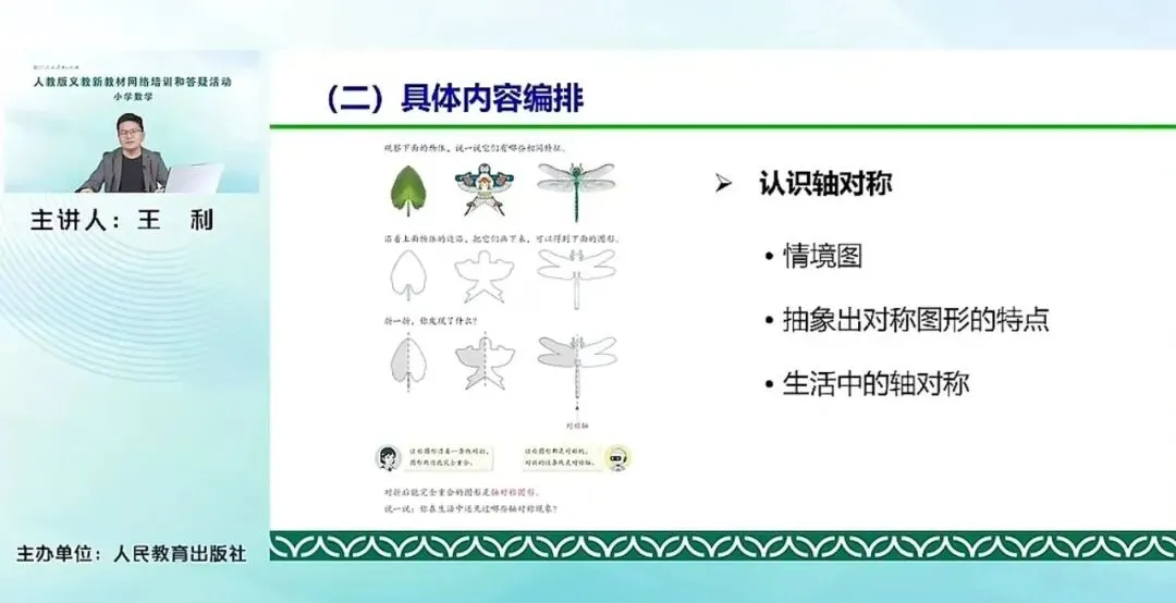 首先我们来看轴对称。教材先呈现生活中的树叶、风筝、蜻蜓图片,唤醒学生对生活中轴对称现象的经验。接着通过描轮廓抽象出图形,随后在画、折活动中体会翻折过程,感知轴对称图形的特征,对称后能完全重合的图形是轴对称图形。最后回到现实生活寻找轴对称现象。