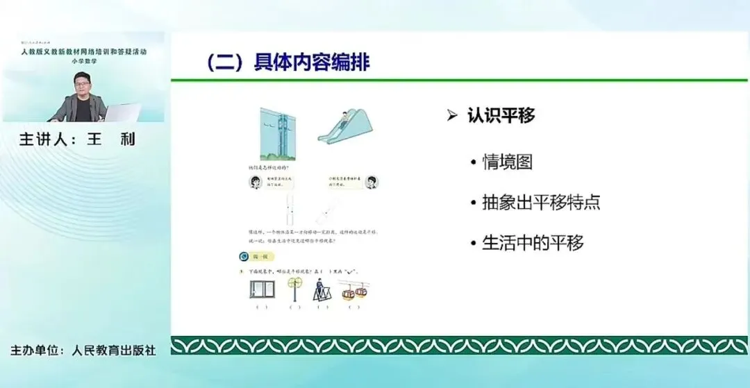 鉴于轴对称现象在生活中较为常见,教材先安排其教学,便于学生从熟悉场景入手,理解抽象图形知识。在编排思路上,原教材安排在二年级,主要通过实物让学生直观感受轴对称、平移和旋转,没有抽象和给出概念的过程。在新教材中,此部分内容安排在三年级下册,内容相对于原教材进行了后移。同时,三年级的学生的抽象思维和二年级学生相比,已经有了比较大的发展。因此,在本册编排的思路上,认识轴对称图形、认识平移、认识旋转,编排思路一样,都加入了抽象的过程,让学生通过生活中的实例初步抽象出图形的运动特征,让学生感受对称、平移、旋转现象的特点,之后再给出描述性定义。