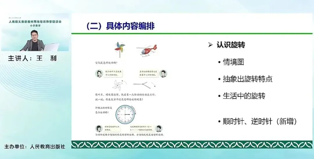 接下来是旋转,教材通过风车和直升机的螺旋桨这两个典型的旋转现象,给出抽象的图形,让学生直观感受旋转的特点。物体的每个部分都绕同一个点转动。之后教材给出了顺时针和逆时针这部分内容,教材从生活实例入手,运用钟面模型,通过直观展示时针绕中心点顺时针旋转的过程,帮助学生理解顺时针、逆时针旋转的含义。其中两个学生的对话,以贴近生活的语言巧妙地渗透了旋转运动的两个关键要素,旋转中心和方向。