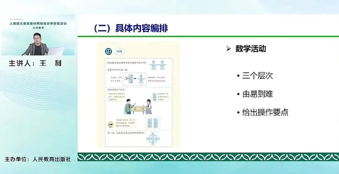 这3个例题之后,教材安排了剪纸这个数学活动。是由原教材的问题解决改编而来的,让学生在活动中运用轴对称图形知识,以此培养他们的动手实践能力,并感悟数学知识与现实生活的联系。教材分三个层次进行编排。第一个层次提出,剪出两个手拉手纸人的问题后,引导学生遵循由易到难的原则,先尝试剪一个纸人。教材详细展示了折、化、剪的完整操作过程,为后续学习做好铺垫。第二个层次,尝试剪出两个纸人。通过两名学生和机器人的对话,呈现了探索、试错以及调整的思考过程,并给出两种方法,同时总结了操作的要点。第三个层次,提出更具有挑战的任务,剪出四个纸人为在一起的图案。尝试时,需运用之前积累的经验,综合运用本单元的知识,既巩固剪纸活动的一般方法。又能在操作中进一步感受轴对称的特征,发展学生的空间观念。