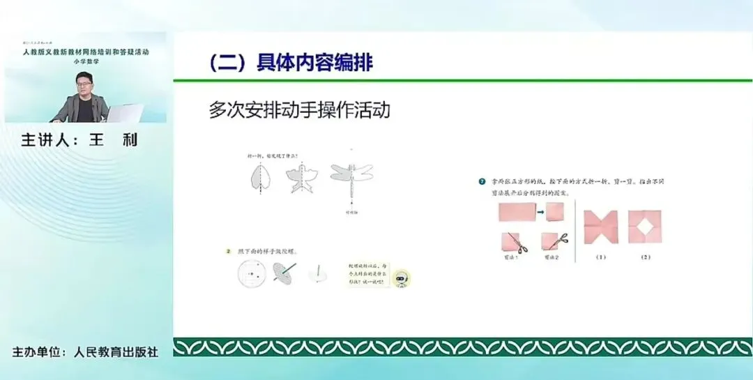 另外,在本单元中,教材多次安排观察与动手操作活动。例如通过折一折感受轴对称图形的特点。通过制作陀螺并转一转感受点的旋转,通过折一折、剪一剪,剪出轴对称图案等等。这些活动让学生在实践中直观感受图形运动的特征。积累学生的基本数学经验。在这个过程中可以培养学生的空间观念,提升学生的数学思维能力。