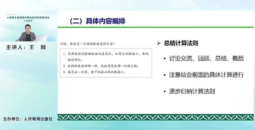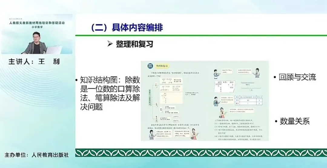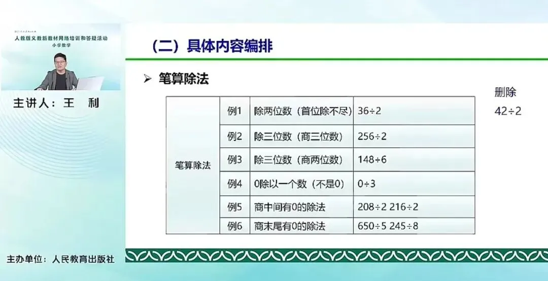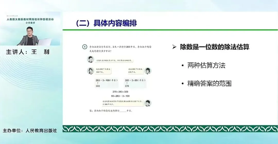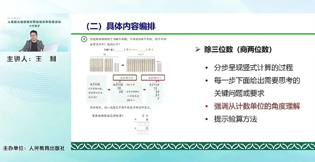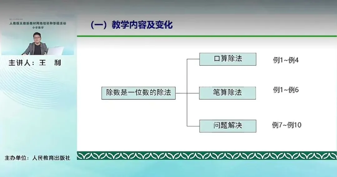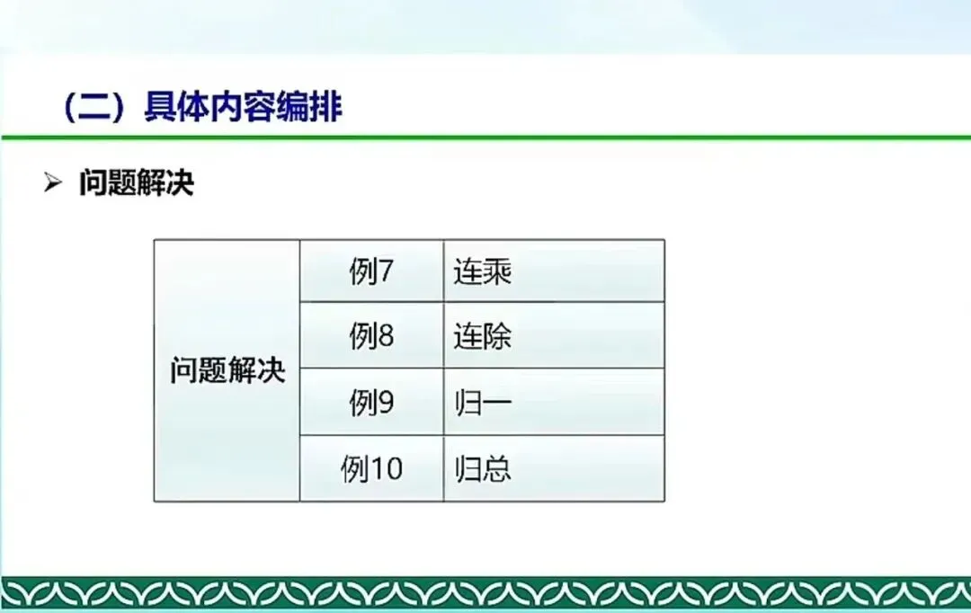 第一个部分内容是口算除法,这部分的口算可以转换为表内除法,为笔算做准备。第二个部分是笔算除法,这部分内容是本单元的教学重点,它是多位数除法的基础。同时在日常生活中有广泛的应用。第三个部分是问题解决,主要涉及利用连乘、连除、乘除混合的两步计算解决问题。这部分口算内容和笔算内容变化不大,问题解决由原来的两个变为4个。