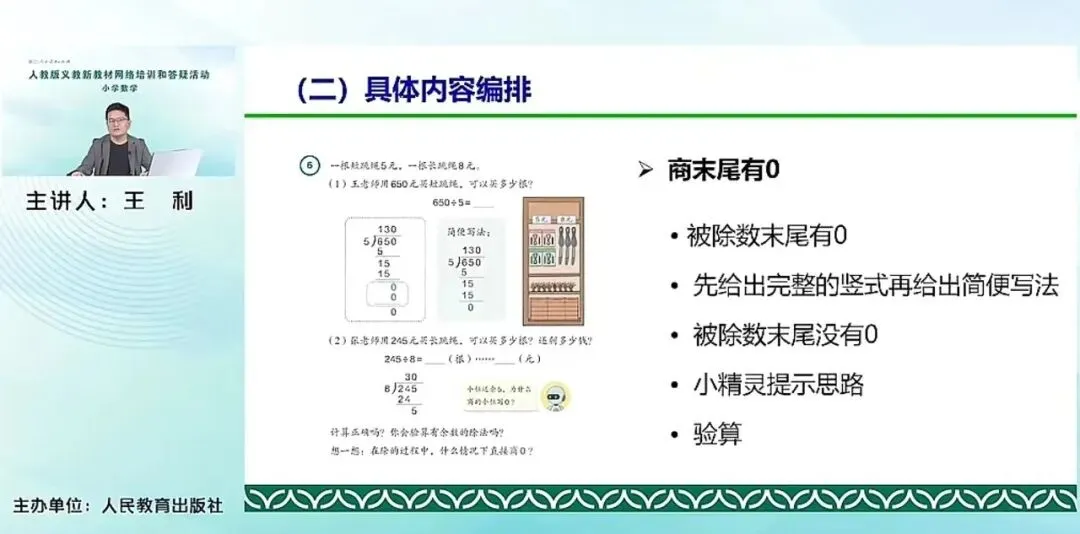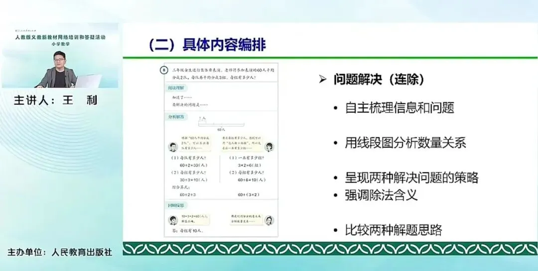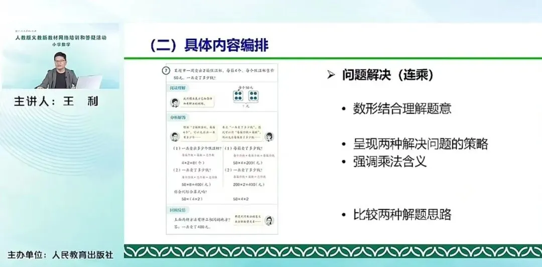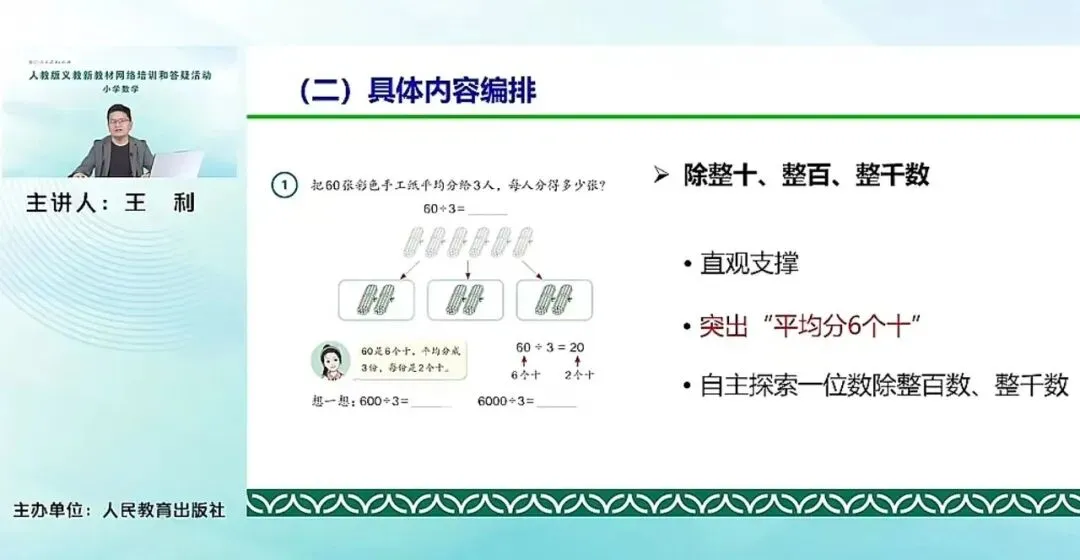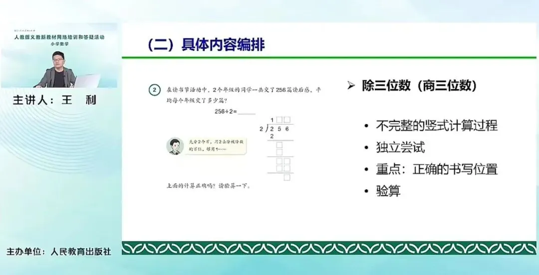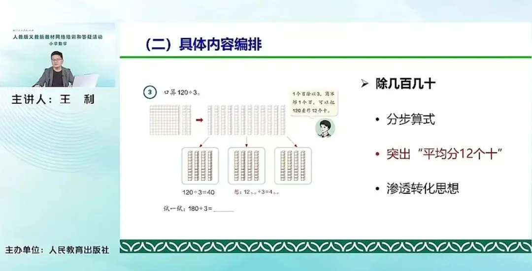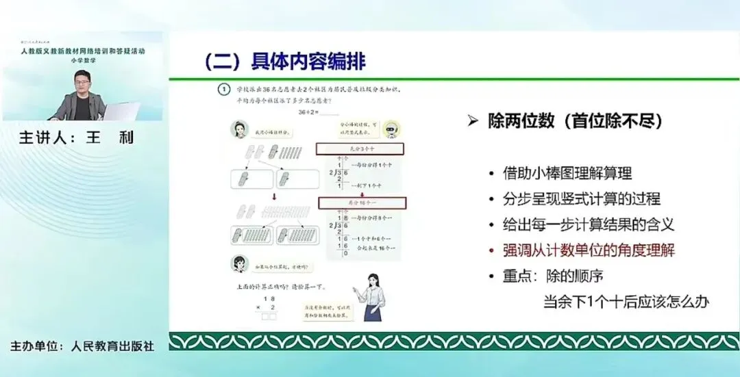 第一个部分内容是口算除法,这部分的口算可以转换为表内除法,为笔算做准备。第二个部分是笔算除法,这部分内容是本单元的教学重点,它是多位数除法的基础。同时在日常生活中有广泛的应用。第三个部分是问题解决,主要涉及利用连乘、连除、乘除混合的两步计算解决问题。这部分口算内容和笔算内容变化不大,问题解决由原来的两个变为4个。