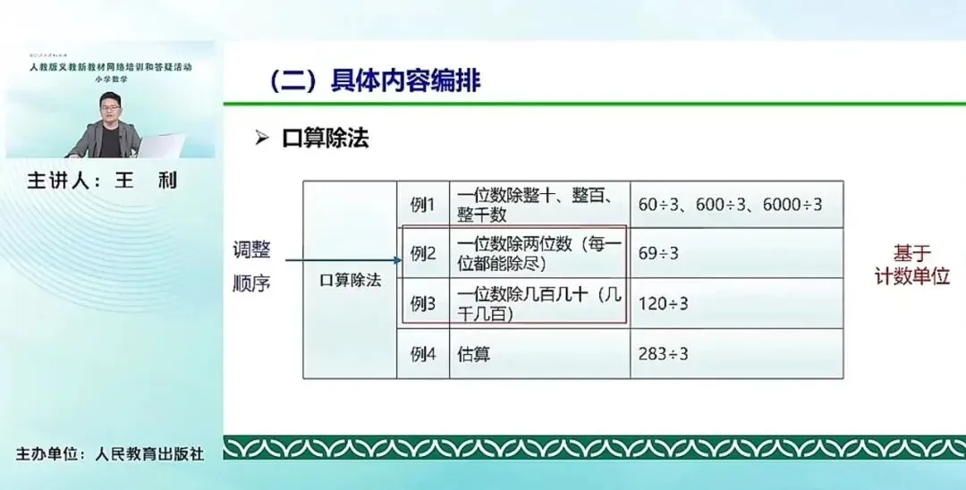下面是本单元的具体编排。我们来看口算这部分。口算除法小结一共有4个例题,前3个是口算的方法。第一学习一位数除整十、整百、整千数的口算。例2学习一位数除几十几的口算,例3学习一位数除几百几十、几千几百的口算。这3个例题凸显了口算方法的共性,就是对计数单位进行平分,例如60就是6个10平均分为3份。这里的一个变化是调整了例2和例3的顺序。先学一位数除两位数,再学一位数除三位数。这样由易到难的编排,利于学生将以往表内除法的学习经验迁移过来,探究一位数除多位数的口算方法。通过口算的三个例题的学习,学生基本掌握了一位数除多位数的一般方法。而随后编排的估算内容是进一步培养学生灵活运用已掌握的口算方法来应对新的问题。同时也为后续的笔算学习奠定基础。在编排上,例1到例3这3个例题都注重通过直观图来呈现除法的算理。